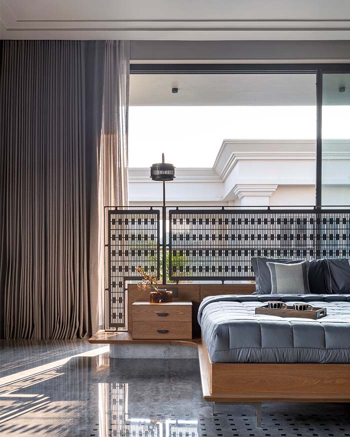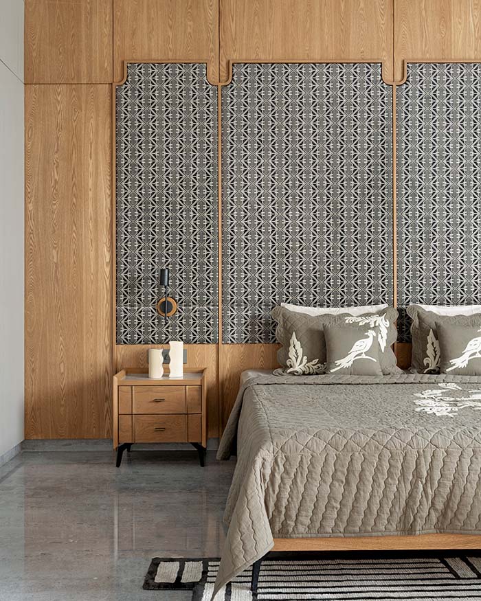 Warm oak anchors the primary bedroom in quiet assurance. The custom bed frame and matching bedside table by a+t associates are dressed in grey quilted linen from D’Decor, while full height pleated curtains in warm taupe soften the floor to ceiling glazing. A geometric metal screen jaali panel by a+t associates serves as both headboard and borrowed view, the balcony and open sky visible beyond. Italian stone flooring from CMC meets a custom inlay rug from House of Knots at the foot of the bed; Photography by Tejas Shah