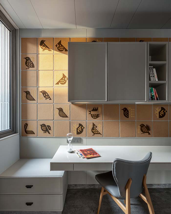 A secondary bedroom study corner draws its warmth from a wall of terracotta coloured tiles hand painted with bold folk bird motifs by a+t associates, gently backlit to cast a steady amber glow across the surface. Below it, a custom built white laminate desk and integrated drawer units by a+t associates offer a clean, quiet counterpoint. An oak framed desk chair in grey leather from D’Decor completes the nook; Photography by Tejas Shah