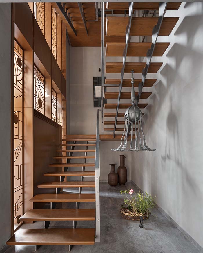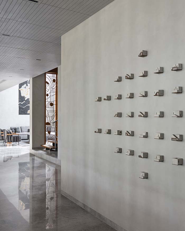 β€œThe form is inspired by organic fluidity,” Archis and Tanvi explain, β€œwhere the central metallic body unfolds into elongated tendrils, creating a sense of downward flow.” The first-floor corridor continues this journey, lined with individually cast concrete architectural maquette sculptures, each one mounted across the expanse of lime plaster, quietly remarkable.