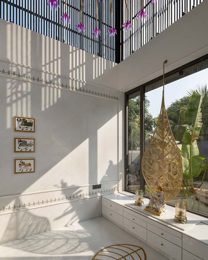 The double height pooja room rendered in white lime plaster with hand painted gold border motifs, framed Pichwai miniatures and a large brass Bodhi leaf cutwork installation is the most devotional space in the house. In Archis and Tanvi’s hands, this Vadodara home becomes something deeper than beauty. It holds its scale with ease and its warmth with conviction.Β