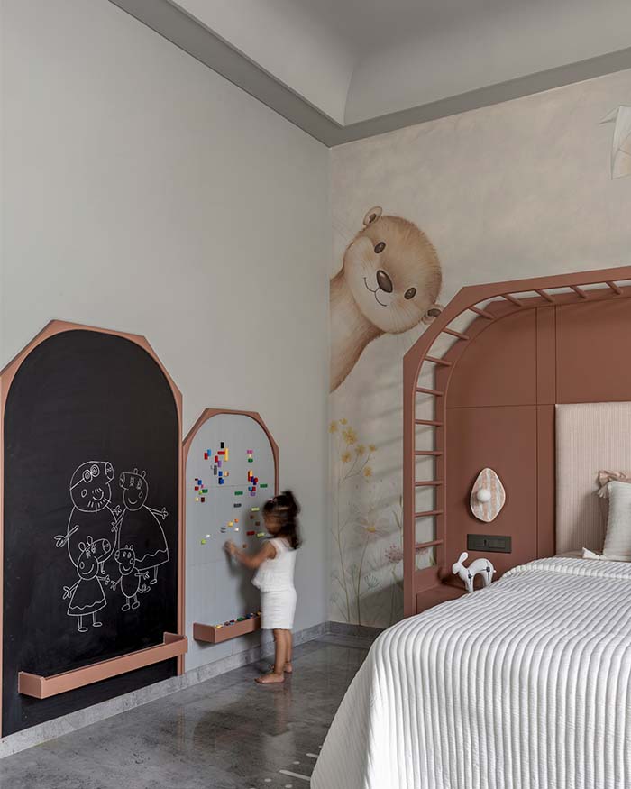 The children’s bedroom is given over entirely to play and imagination, with a hand painted bear mural, a terracotta pink arched chalkboard wall and a motor skills activity wall. The study features a backlit tile wall hand-painted with folk bird motifs, its warm amber glow a quiet pleasure to work beside.