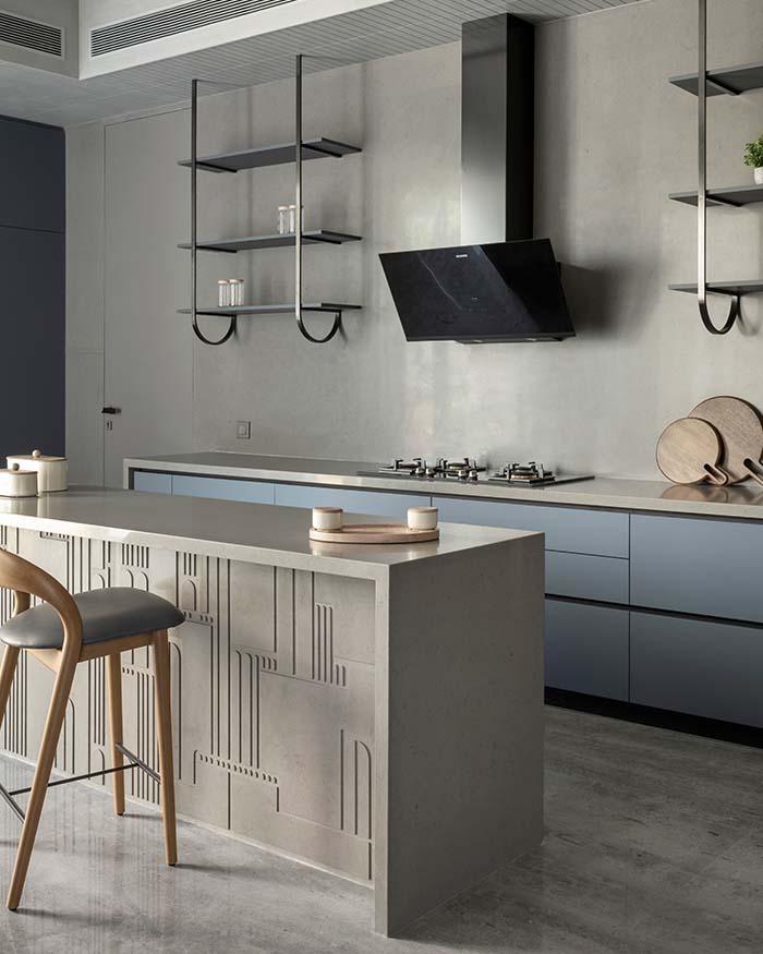 In the show kitchen, the concrete island with a geometric linear incised pattern by a+t associates doubles as a work of surface craft, its quartz countertop clean and considered. Slate blue base cabinets and suspended black metal open shelving line the cooking wall, centred on a black angled Siemens chimney hood. An oak framed bar stool with grey leather upholstery from D’Decor stands at the counter; Photography by Tejas Shah