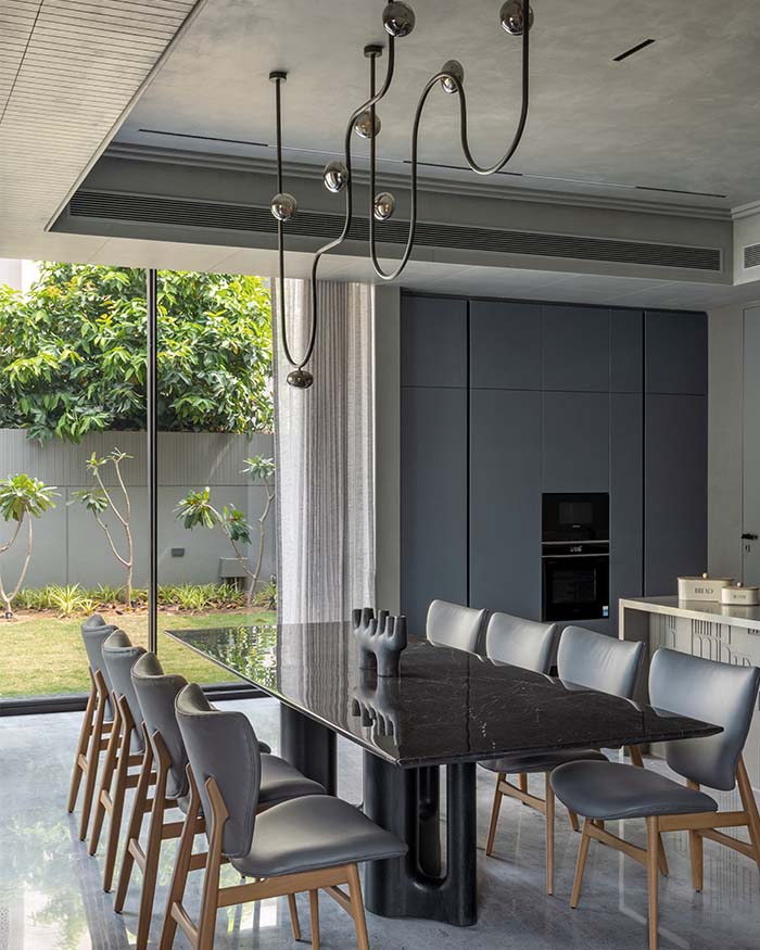 The dining room announces itself through a large black marble top table on a sculptural black pedestal base by a+t associates, commanding the centre of the space with quiet authority. Grey leather upholstered dining chairs with oak legs from D’Decor gather around it, while a custom black steel chandelier with sinuous tubular arms and chrome orb pendants by Kaanch presides overhead. Full height slate grey cabinetry with an integrated Siemens wall oven frames the kitchen behind; Photography by Tejas Shah