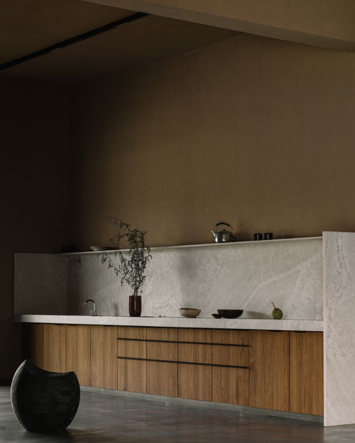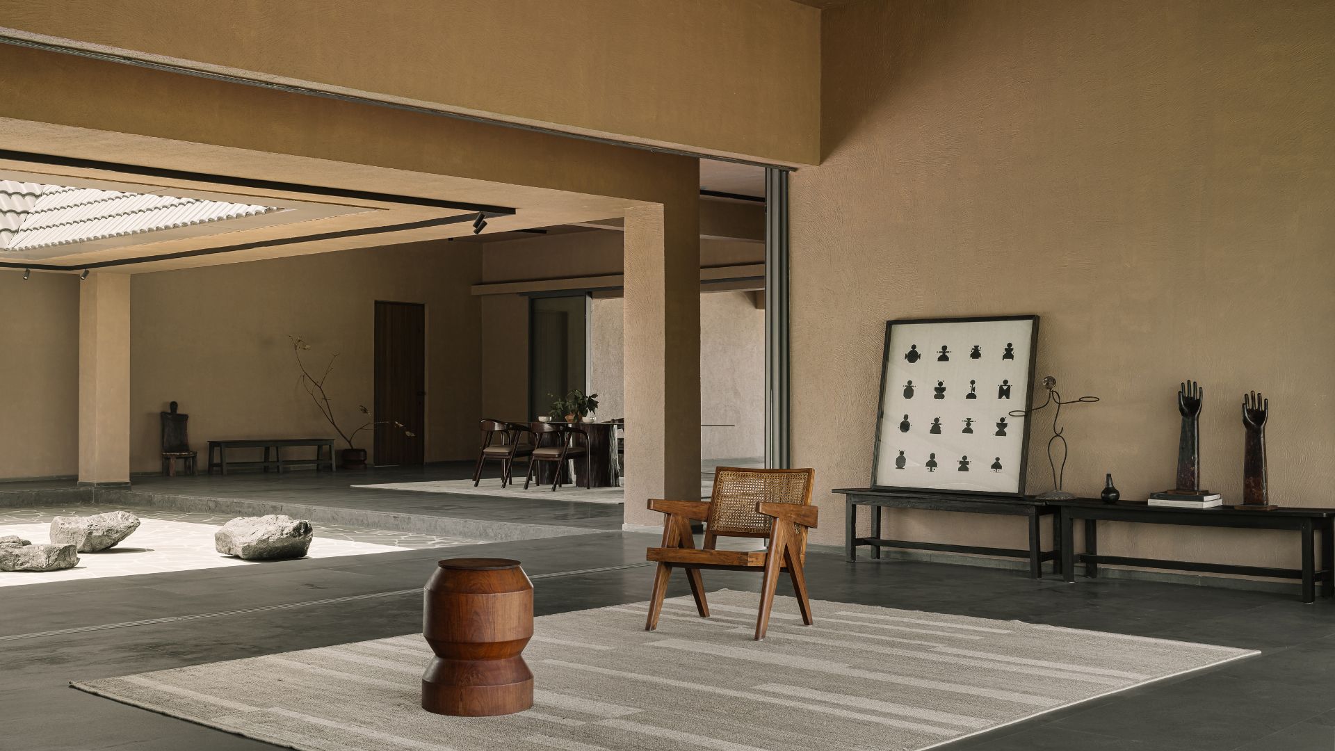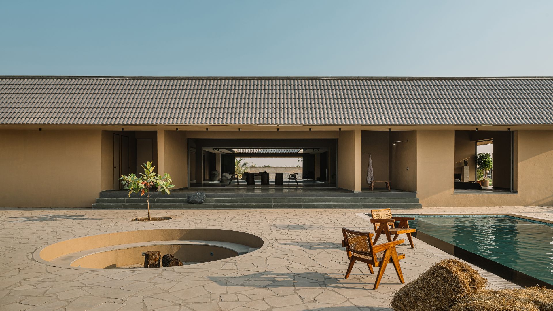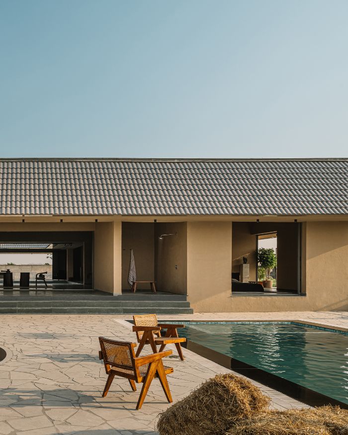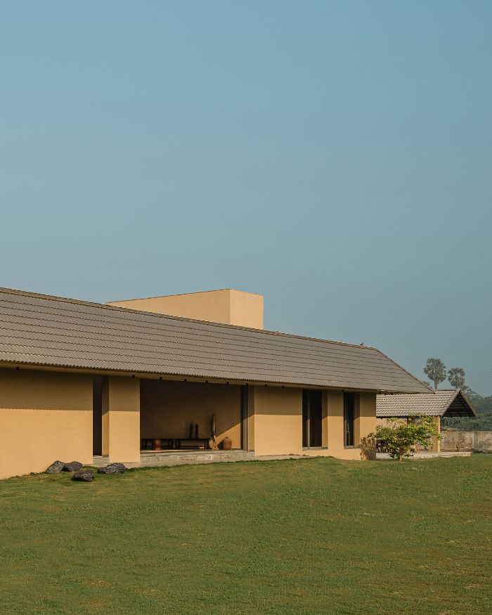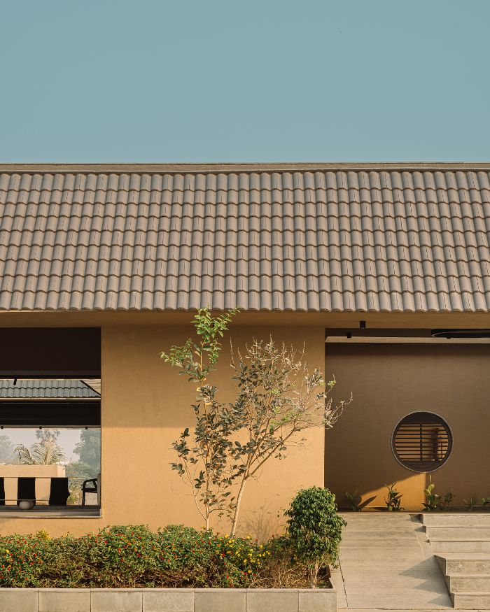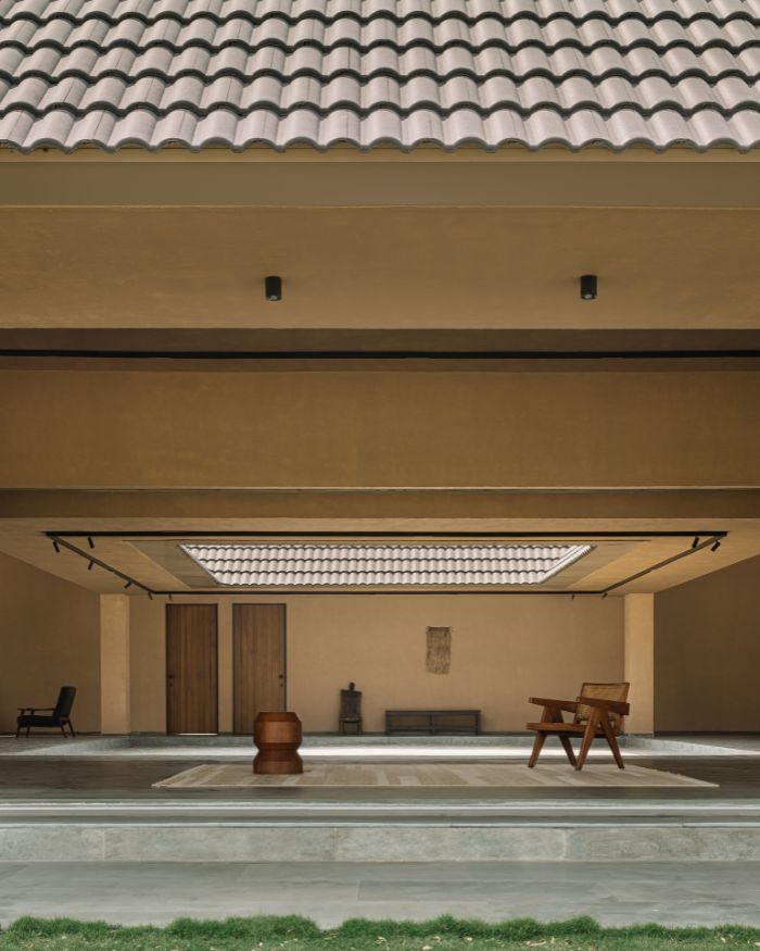 The home interacts with the sky, making a clear-cut geometric division of the space below and above, that co-exist side by side. The sloping roof in the silent courtyard frames the skyline, like a picture that changes across time. The vast expansive nature evokes you to reflect outwardly, yet makes you feel right at home. Natural light enters the home through this opening, touching and illuminating the deep walls, flitting shadows that move across the space prompting changes in the tones and temperature. Seeking inspiration from the traditional, the home provides a serene sanctuary under a dynamic sky.