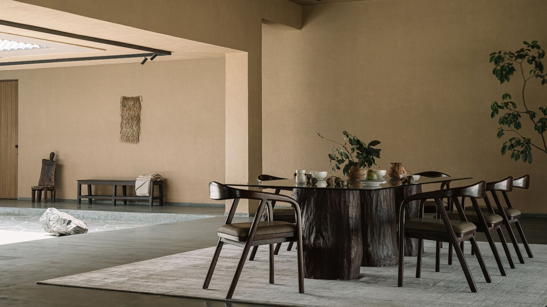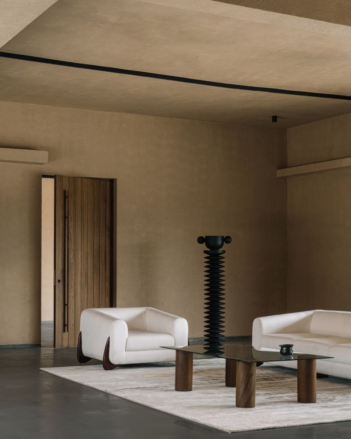The home embodies inspiration from early Chettinad style tropical houses. Hand-applied sand-textured walls are companions to the site’s soil tone. Rough-cut Kota stone mosaic flooring guides visitors across the home, intermingling from the outdoor tranquility to the embrace of a sanctuary inside. Warmth of natural wood exudes from the furniture and detailing in the doors, which makes a silent conversation with its traditional context. “The findings of understated contemporary language to striking traditional building materials lends purpose and character to the minimalist spaces and helps render a quaint aesthetic of erstwhile tropical houses,” say Jhanvi and Rakshit.