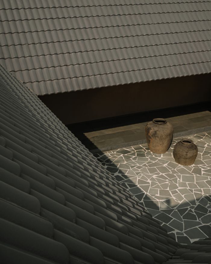 The home is complete with furnishings of vintage artefacts, large earthen pots and handpicked furniture. A contemporary intervention of custom cement tiles on the Chettinad style single sloping roof ties the home together, giving it character while maintaining the appeal of a tropical house.