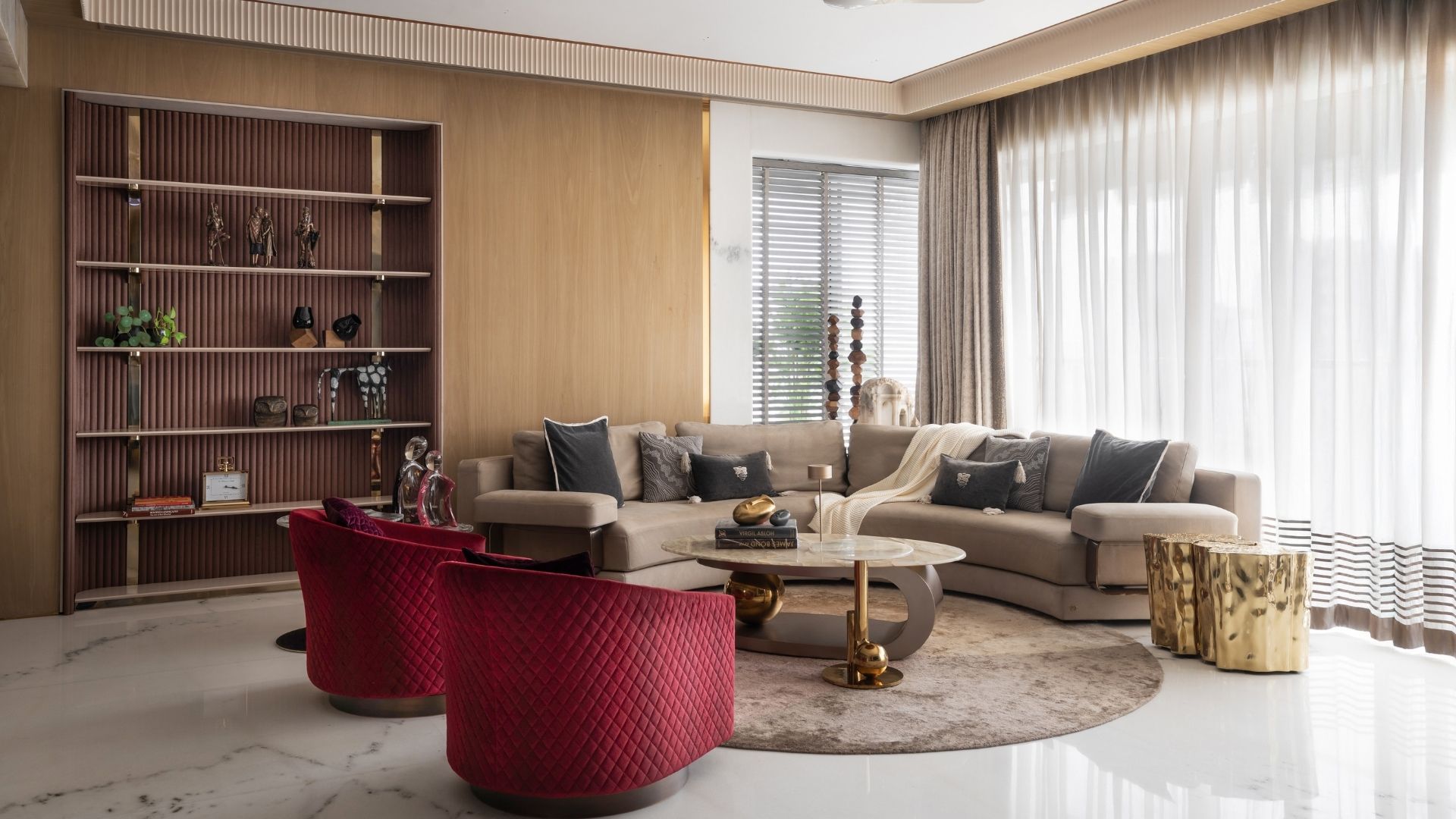 Two striking red velvet swivel chairs punctuate the otherwise neutral living area — a deliberate move that infuses vitality into the space without disturbing its serenity. The curved sectional sofa, the metallic sheen of the coffee table and the organic texture of the Hands Carpet beneath create a living tableau that feels both grounded and glamorous. Every element is in dialogue — the shine of metal softened by matte surfaces, the geometry of form counterbalanced by the flow of light filtering through sheer drapes.
