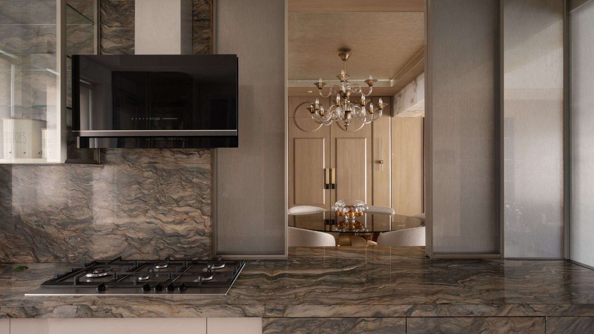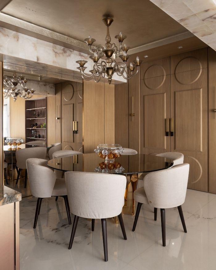 Throughout the home, that belief takes shape in textures that converse quietly — the rippling stone of the kitchen backsplash, the velvety warmth of upholstered forms, the mirrored reflections that stretch space without overwhelming it. The kitchen, sheathed in a swirling expanse of marble with earthy veins, is designed as both utility and art. It opens seamlessly toward the dining area, merging domesticity with elegance. The glass-fronted cabinetry, soft beige tones and metallic detailing lend it an almost gallery-like grace — an atelier of modern living.