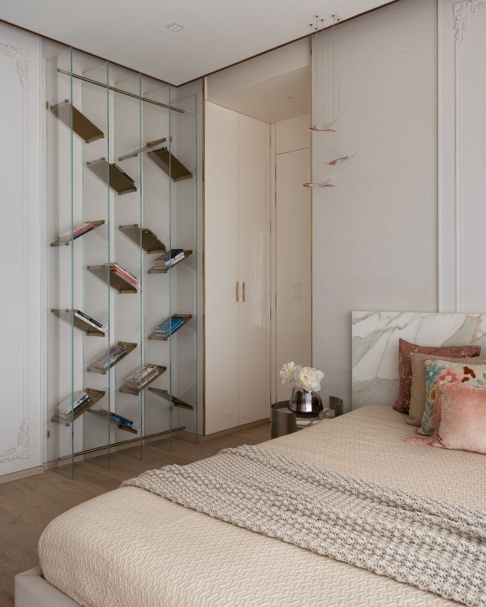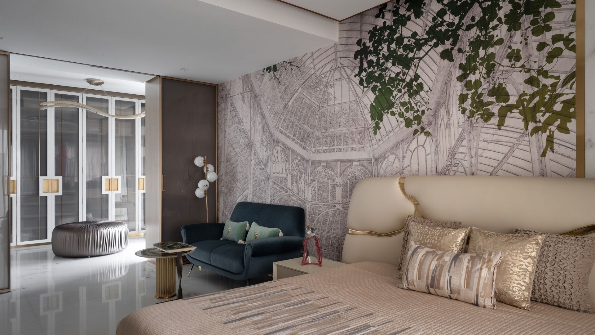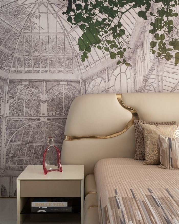 The bedroom unfolds as an intimate retreat, upholstered in soft blush and champagne tones accented by touches of gold. The bed’s sculptural headboard with metallic inlays reads almost like jewellery — delicate yet defining. Behind it, a hand-painted mural of an ethereal greenhouse forms a poetic backdrop, bringing nature indoors in an abstract, dreamlike manner. Plush cushions, sheened fabrics, and ambient lighting together craft an atmosphere of repose, where morning light feels like silk and night falls in slow motion.