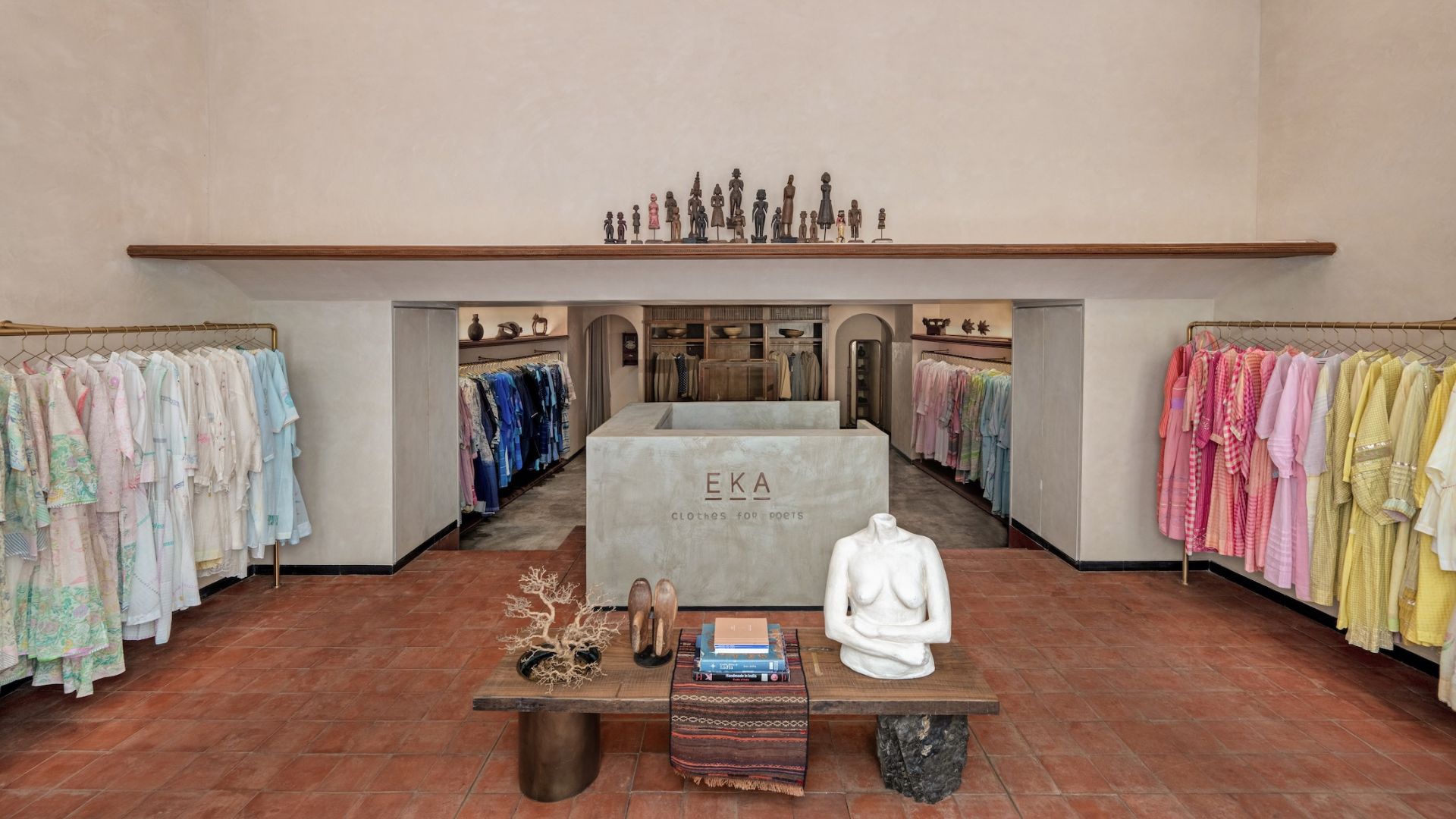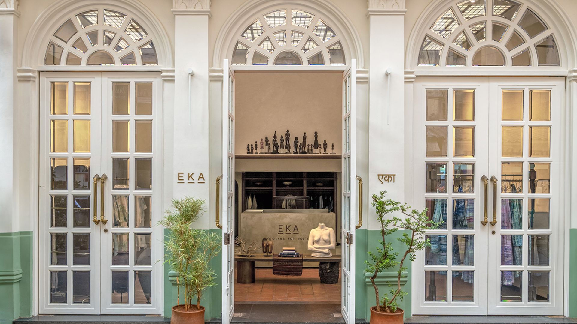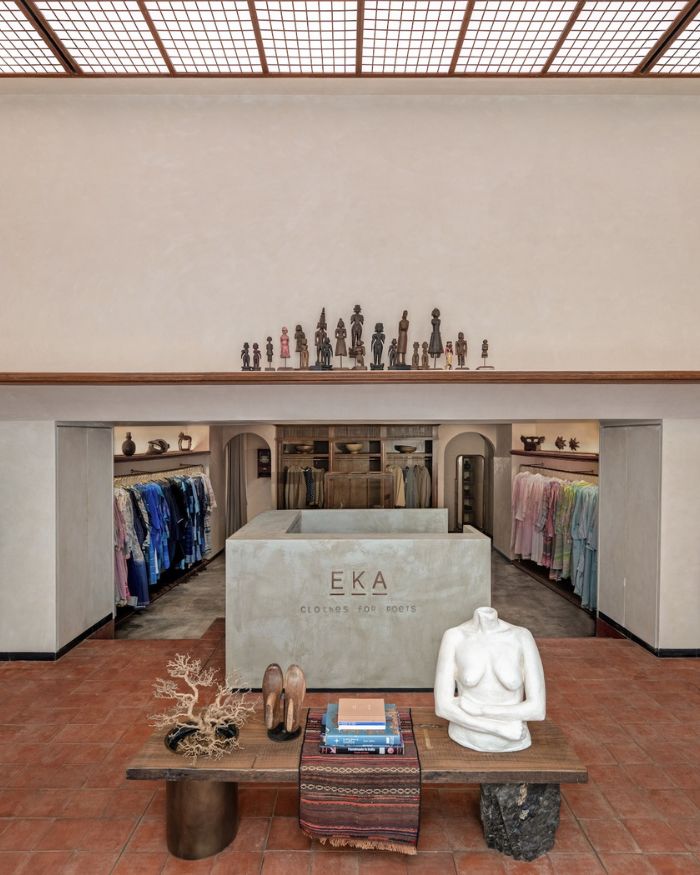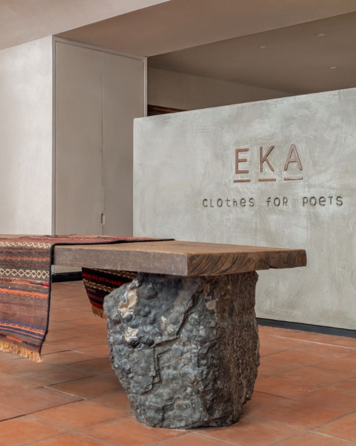Walking through the neo-Palladian doors of the new EKÁ store in Mumbai is like experiencing a glimmer of Indian minimalism, much like the woven identity engulfed within its details. Indeed true to its tagline as it says on Instagram: clothes for poets. The flagship appears grounded yet uber-contemporary imagined by the label’s founders Rina Singh and Sandeep Dua. The sensory journey for EKÁ begins right in the backdrop of Kala Ghoda, adjacent to an old bakehouse, where it weaves the details naturally in the context of heritage, not as a contrast, but as a continuation. For the founders, the place is deeply autobiographical. The poetic calm lingers in the limewashed textures, reclaimed wood and bajra glass; a still spectacle evoking emotional resonance. Singh’s reflection of her childhood remains rooted in her present creations, perfectly capturing the essence of EKÁ’s philosophy.