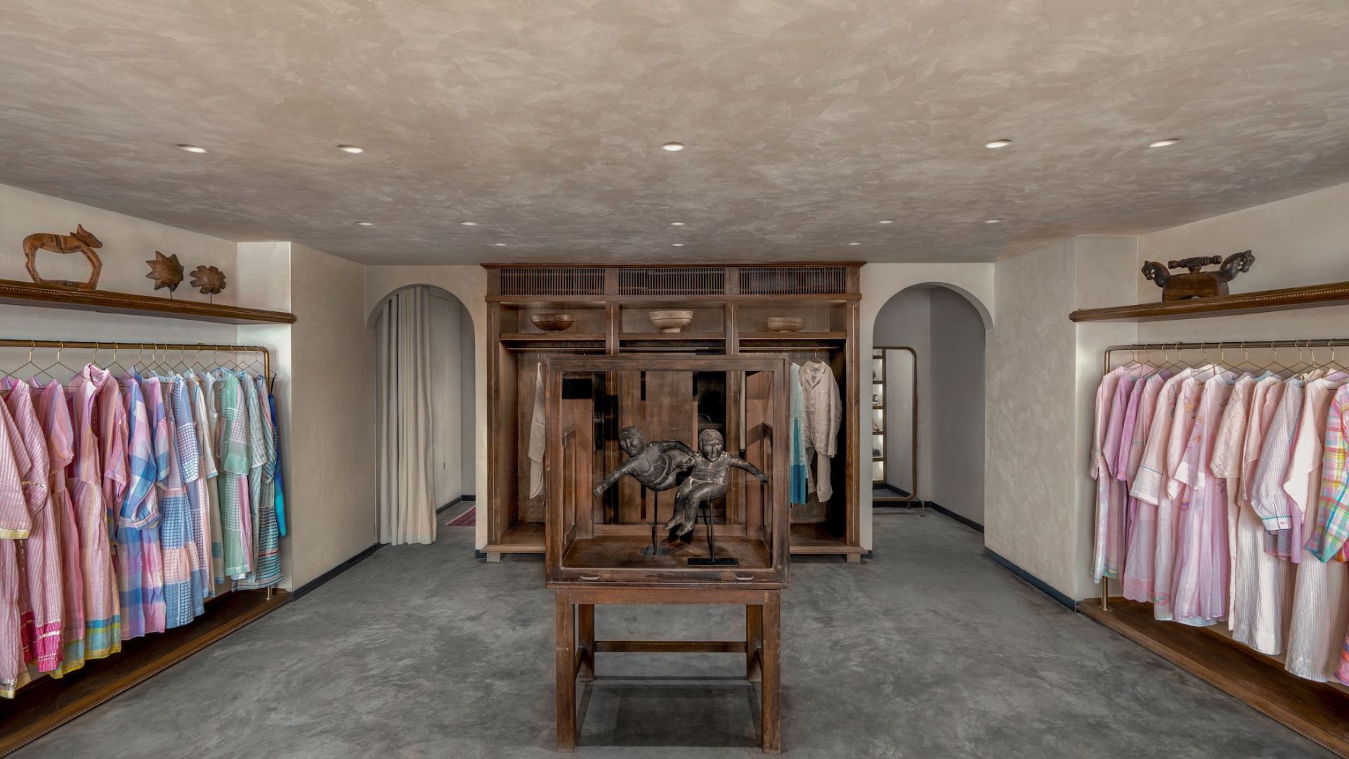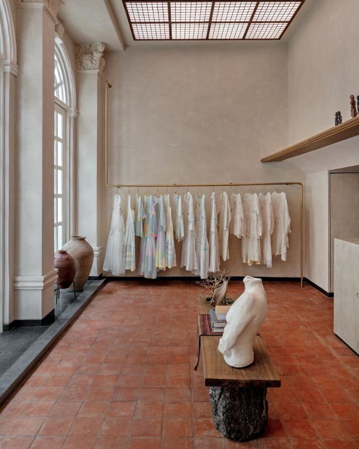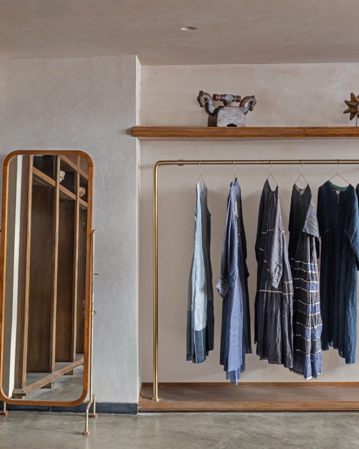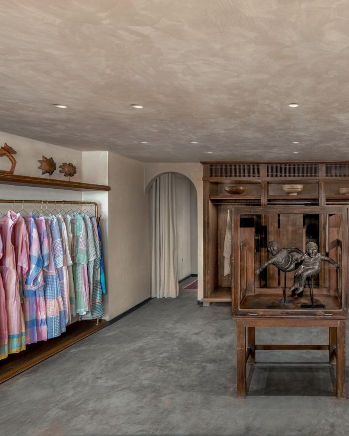 Walking through the neo-Palladian doors of the new EKÁ store in Mumbai is like experiencing a glimmer of Indian minimalism, much like the woven identity engulfed within its details. Indeed true to its tagline as it says on Instagram: clothes for poets. The flagship appears grounded yet uber-contemporary imagined by the label’s founders Rina Singh and Sandeep Dua. The sensory journey for EKÁ begins right in the backdrop of Kala Ghoda, adjacent to an old bakehouse, where it weaves the details naturally in the context of heritage, not as a contrast, but as a continuation. For the founders, the place is deeply autobiographical. The poetic calm lingers in the limewashed textures, reclaimed wood and bajra glass; a still spectacle evoking emotional resonance. Singh’s reflection of her childhood remains rooted in her present creations, perfectly capturing the essence of EKÁ’s philosophy.