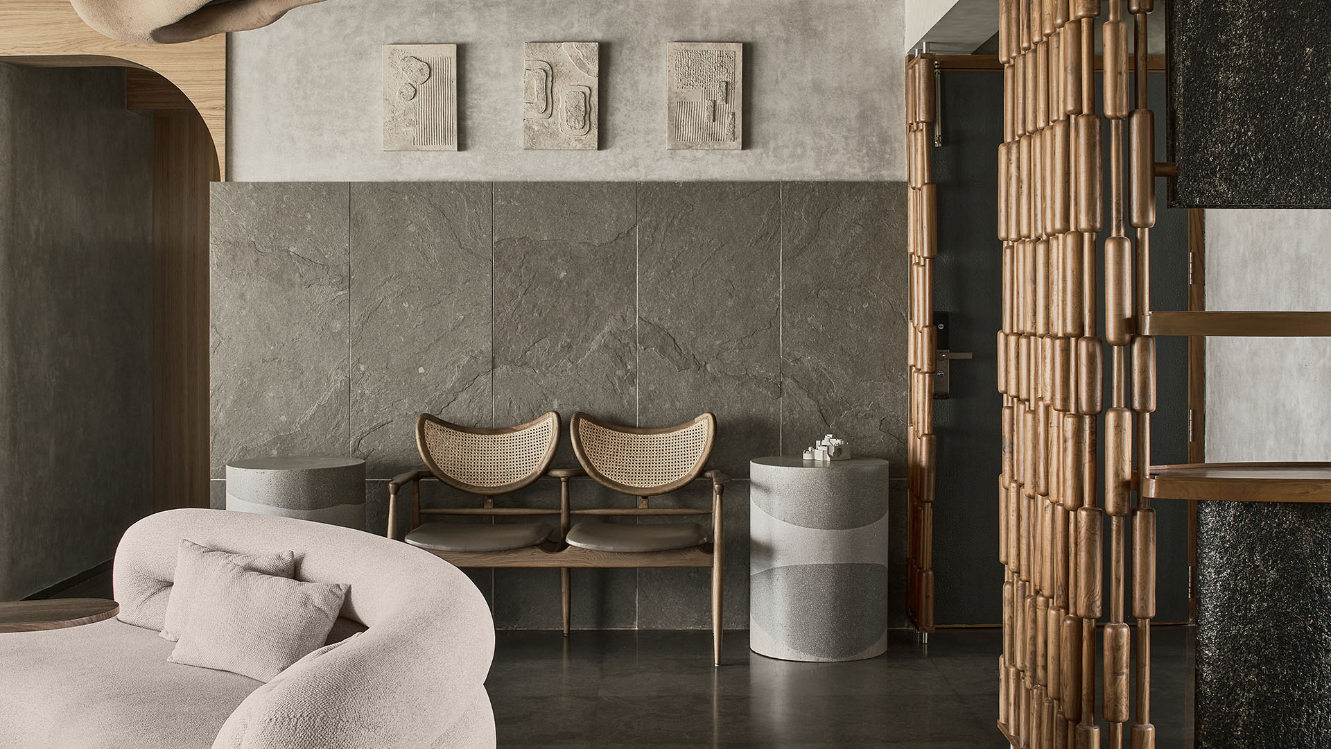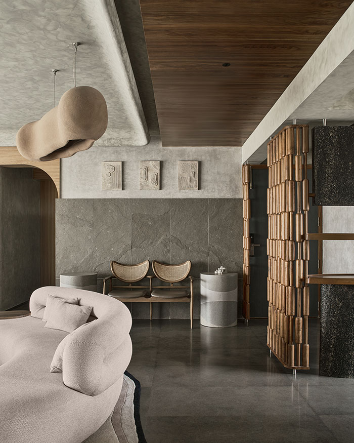 Millennial grey has had a rough run. Once the darling of 2010s interiors, it’s now easy to dismiss as too corporate, too sterile, too predictable. But every now and then, a space makes you stop before writing it off entirely. The grey starts to feel calmer than cold and warmer than you’d expect. With Ekara, Tejal Mathur of her eponymous firm makes a compelling case for the palette working with cool limestone floors, textured concrete walls that exist around unexpected moments like a deep red bar and a curious swing that keeps things from feeling too one-note.