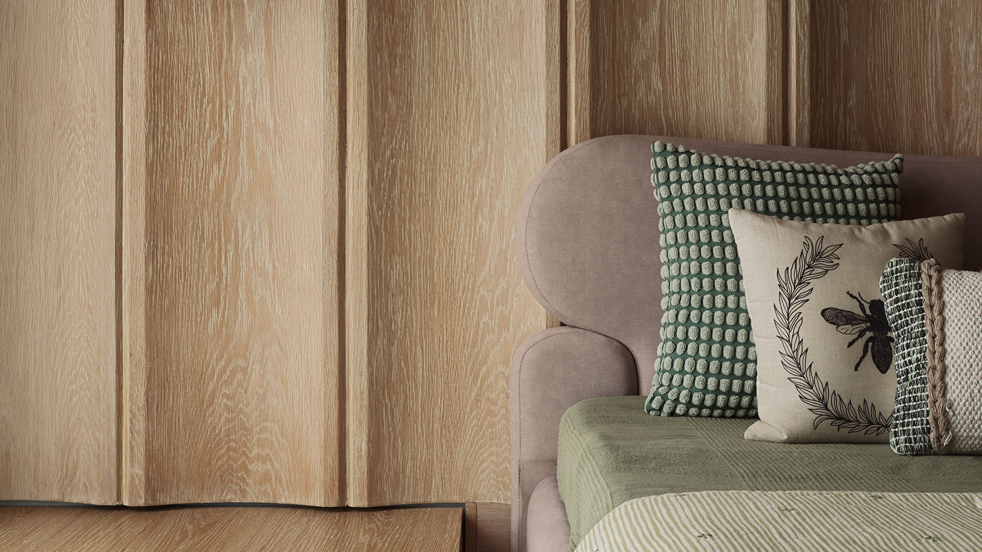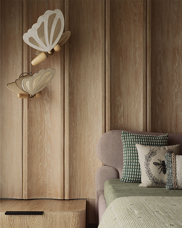 A peek into the daughter’s bedroom, where oak panels and hanging butterfly-shaped lights from Lumi frame a sweet palette of pastel pinks, sage and buttercream; Photography by Yadnyesh Joshi