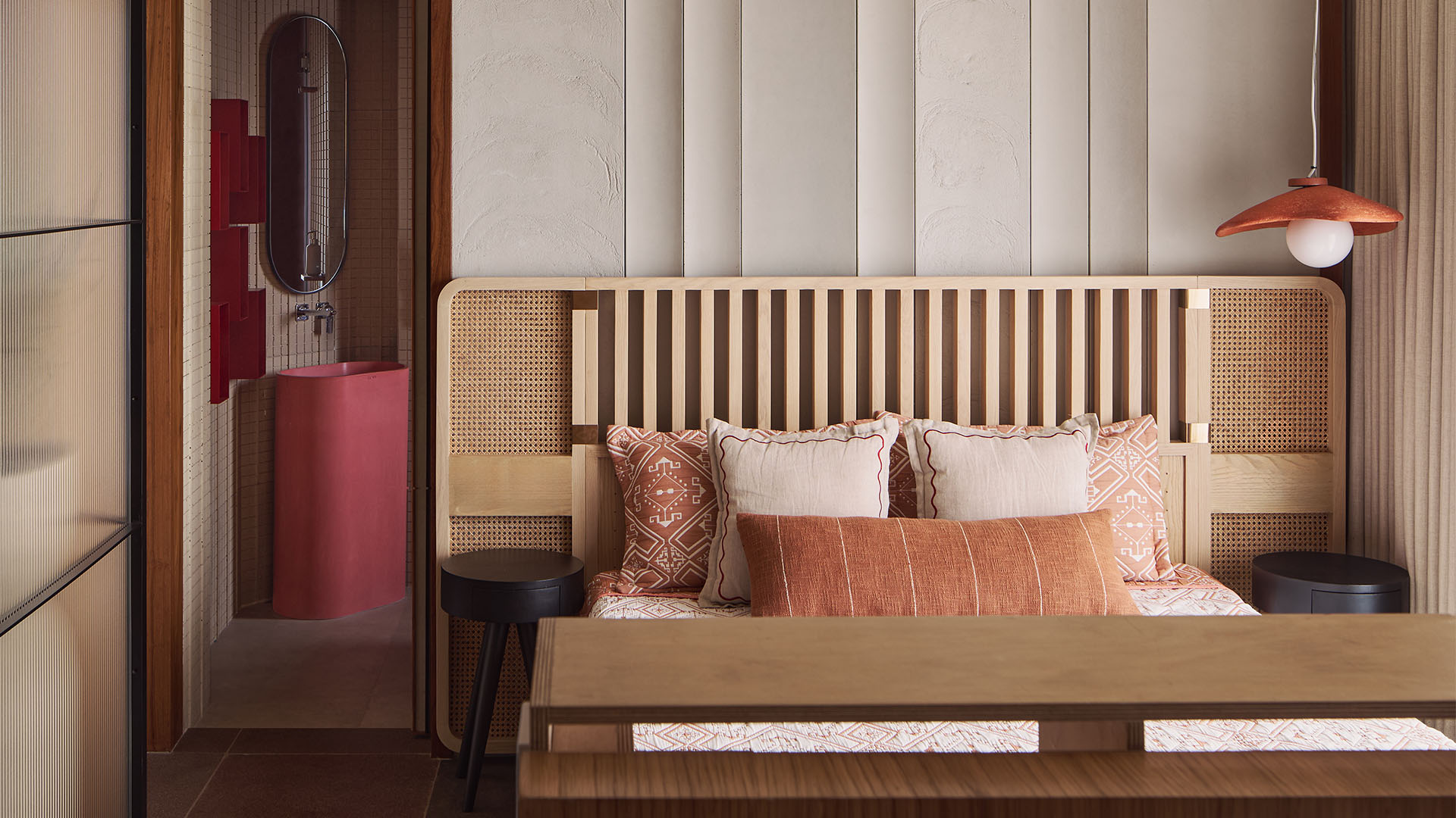 Warm shades of autumn fill across the elder son’s room, grounded by concrete panels by Nuance Studio and limestone floors. Clean lines and pared-back textures make the space sharp yet inviting; Photography by Yadnyesh Joshi