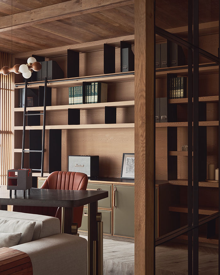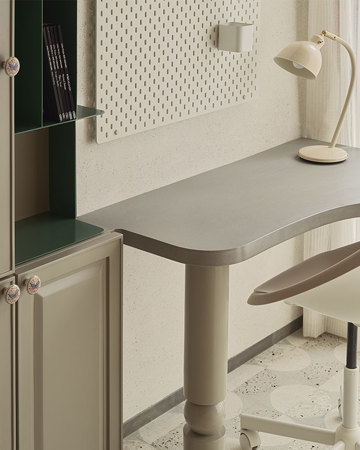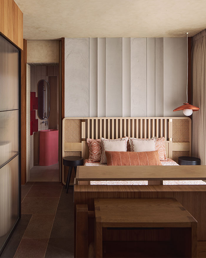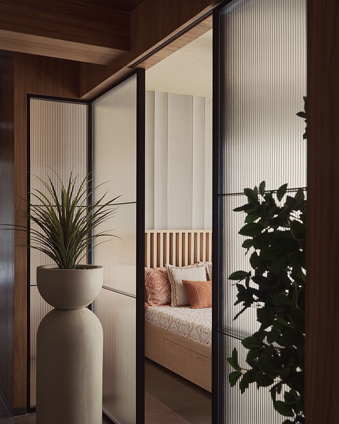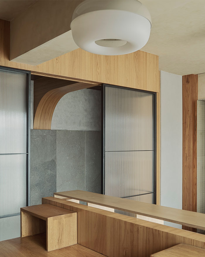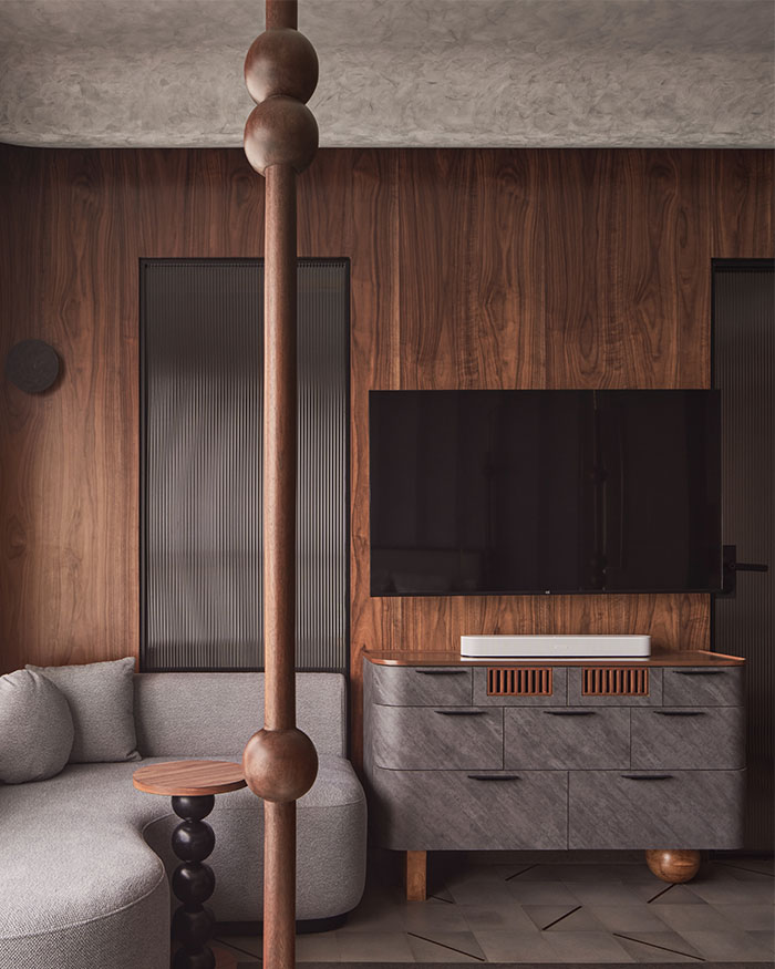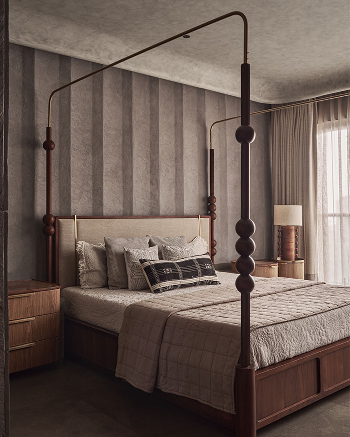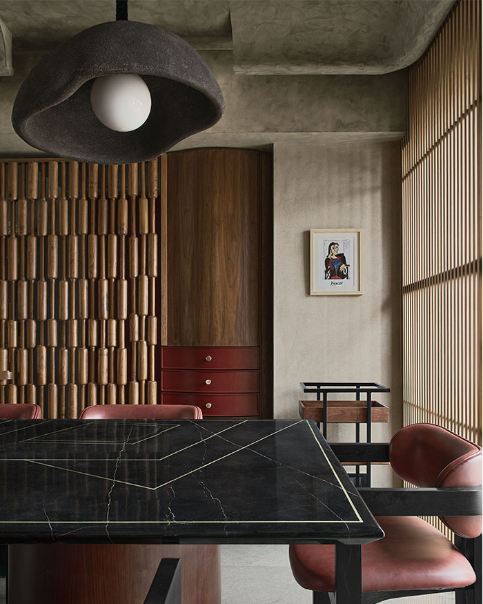 In the daughter’s room, that softness comes through in pale tones, gentle lighting and furniture that feels almost cloud-like, but is in fact built in and steady, made to be leaned on, clambered over and slowly grown out of. The elder son’s room moves in a sharper, more pared-back direction, with concrete and stone grounding it just enough. Elsewhere, the home loosens up. The limestone flooring slips into a hopscotch-like pattern underfoot, with rough stone walls and a timber-lined ceiling framing the hallway. While in the master bedroom, a handcrafted, abacus-inspired bed adds just enough play to offset the dark tones and clean lines.