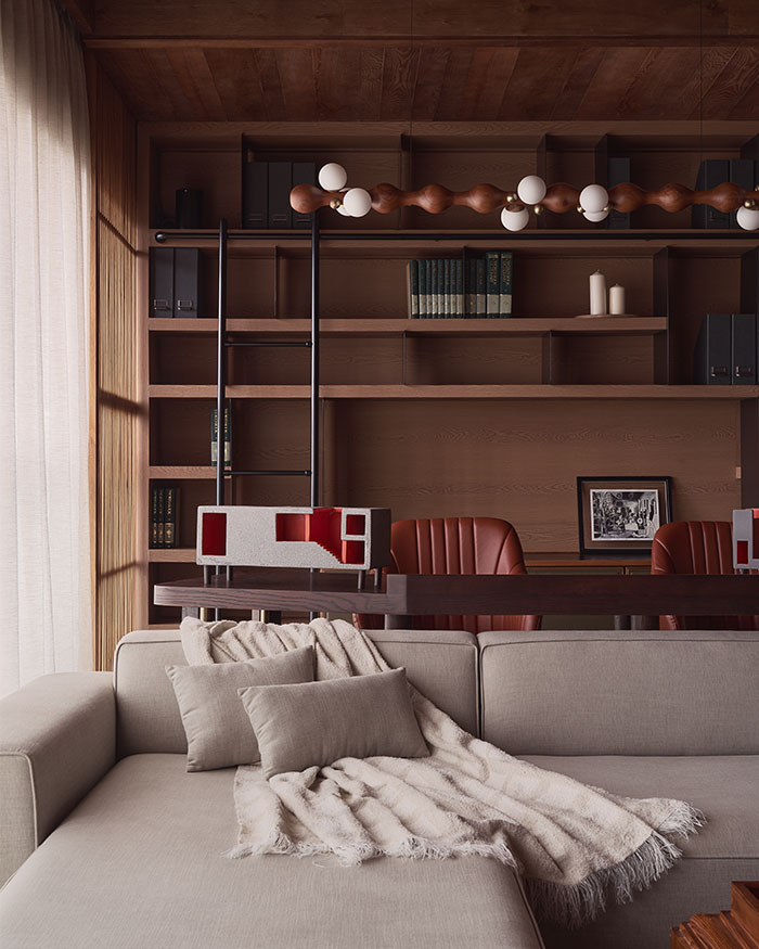 The family den balances warmth and structure, with a timber ceiling, a sofa by Cottons and Satins, and a hanging study light from Studio Indigene; Photography by Yadnyesh Joshi