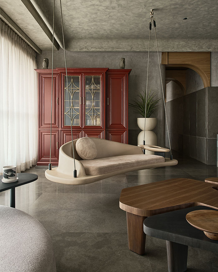 Limestone floors anchor the living area, while a bold red bar cabinet introduces an unexpected pop of colour into the otherwise grey and wood palette. A white statement swing by POD and coffee tables by Hands and Minds complete the layered, tactile setting; Photography by Yadnyesh Joshi