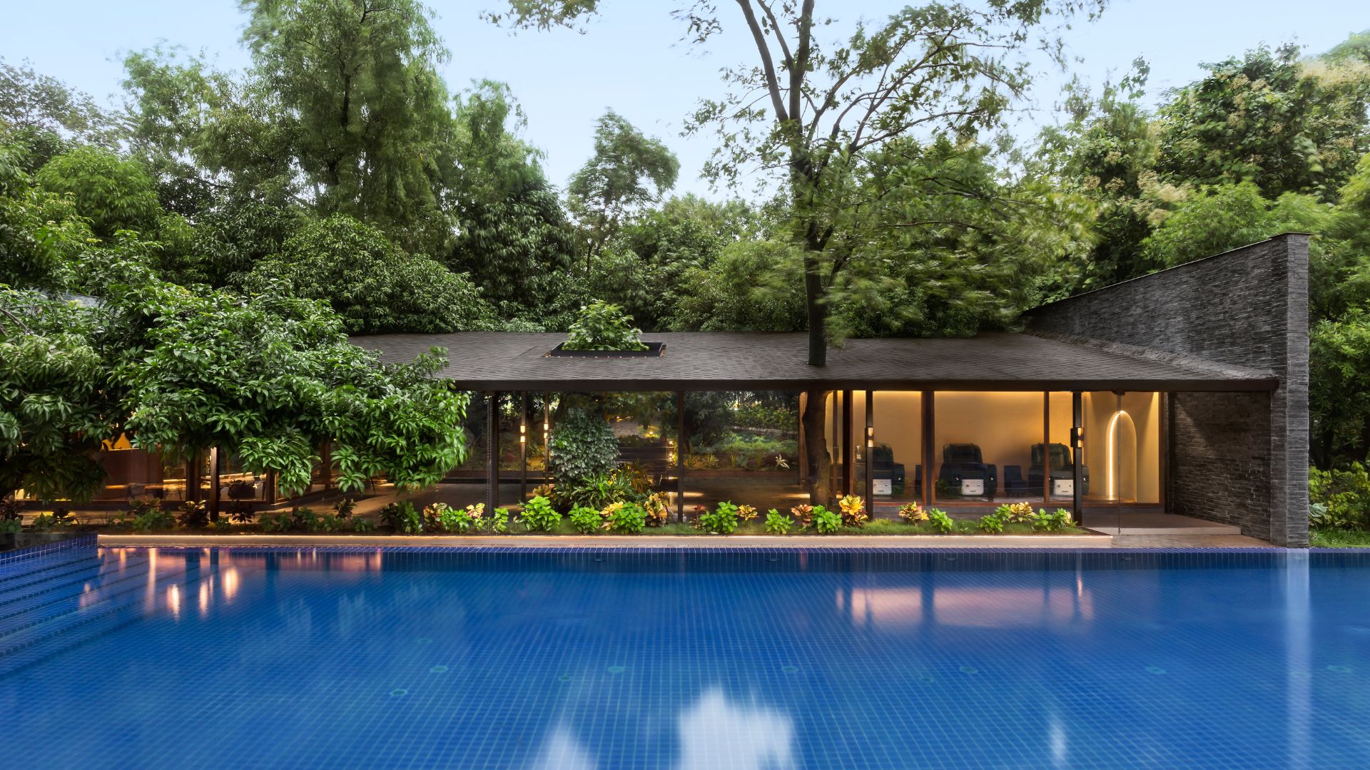 The entrance wing, as seen from the swimming pool and trees ascending through the roof; Photography by Kunal Bhatia