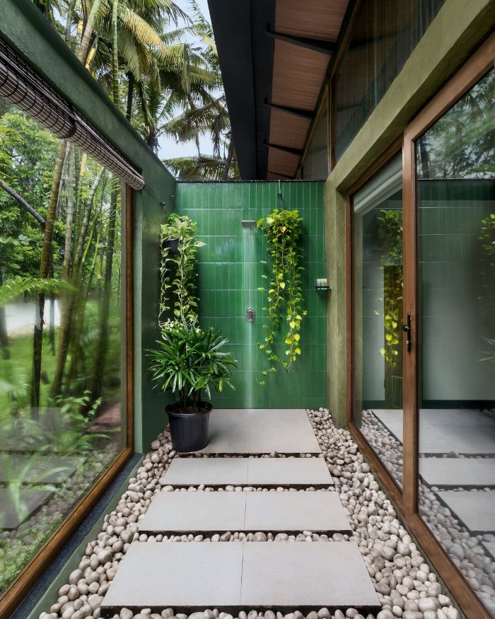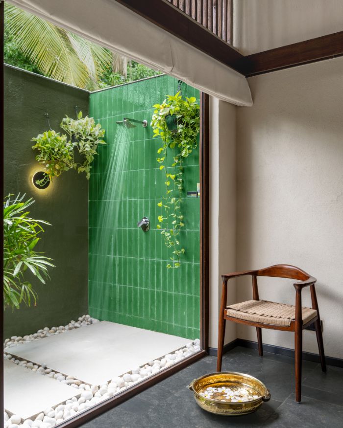 The outdoor open-to-sky shower area with a basalt flooring and teak wood; Photography by Kuber Shah