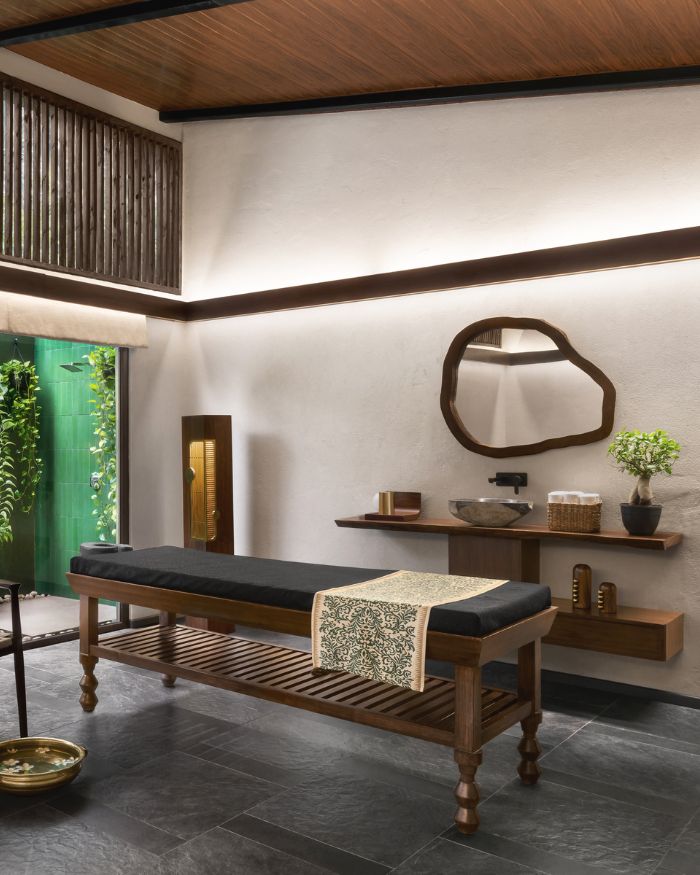 Spa room at the wellness retreat with furnishings made from natural wood on-site; Photography by Kunal Bhatia