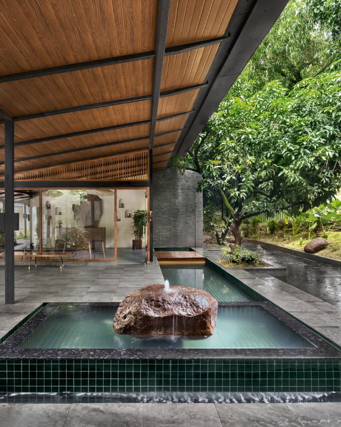 Wellness isn’t just a fleeting idea for the visitor, there are reminders in design too. Visitors are compelled to reflect inwards not only due to the serenity of the space, but the mindful architecture that dots the wellness centre. The roofs of the individual wings are sloped inwards — an indication that visitors should look within themselves. The structural element at the front and centre of the entrance wing is a silent, seemingly floating rock over a shallow pool of water. “Designing a soaring piece of rock to appear as if floating over a shallow pool of water was both technically challenging yet creatively satisfying” say Ravi and Sagar. The rock is a metaphor to keep “a mind afloat” enhanced with the gentle sound of rippling water. The space exclusively uses soft ambient lighting to allow natural sounds to heighten the user’s experience. The wellness centre is described as a portal of inner peace, with their intention to create a space that imbibes meditative qualities, not just physically but spatially.