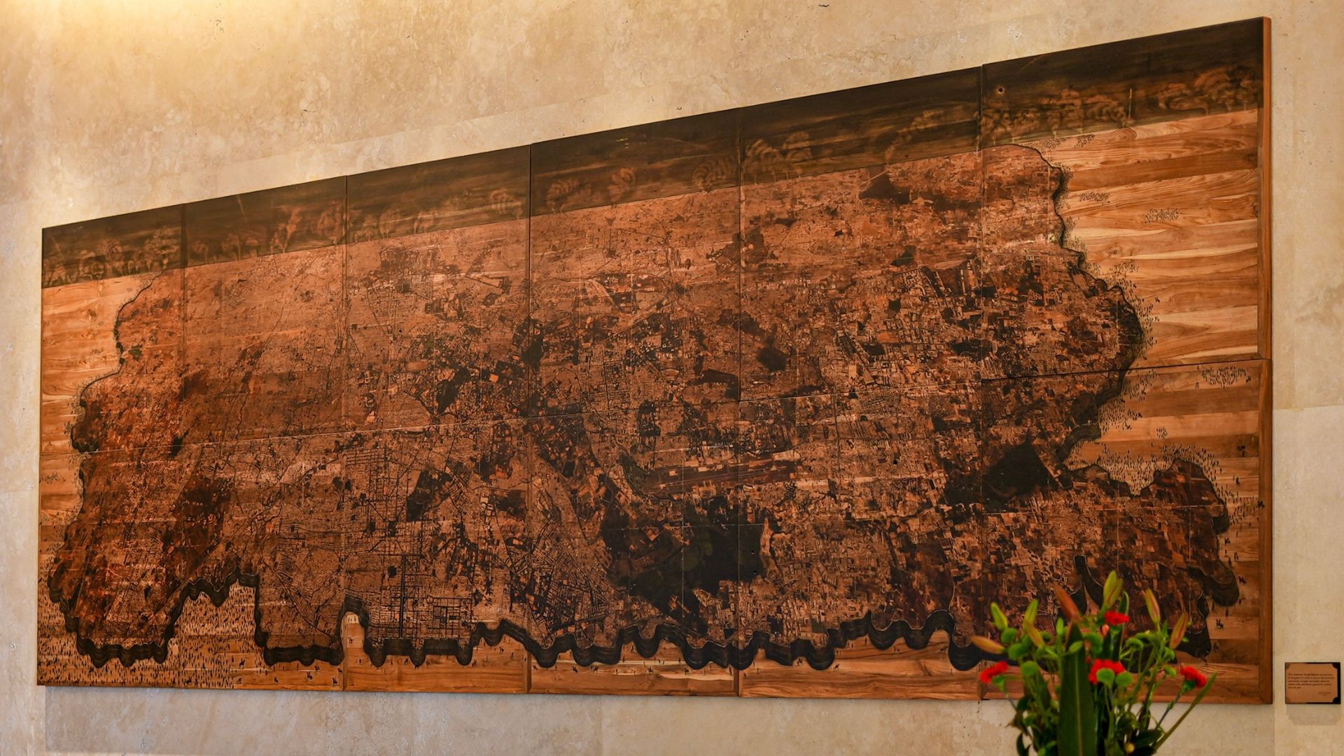 At its core, the hotel functions as a living archive of contemporary Indian art, bringing together original works by over 25 artists. Eschewing decorative convention, the collection invites guests into layered narratives, each piece offering a distinct lens into India’s evolving cultural identity in a layered exploration of identity, memory and modernity. At reception, Saju Kunhan’s Urban Palimpsest maps Bengaluru across repurposed teak, merging satellite imagery with ancient fort walls. In the lobby lounge, Manjunath Kamath’s monumental ceramic discs draw from southern dynasties, while Laxma Goud reflects on shifting identity through raw, expressive bronze. A sharper critique emerges in Sumedh Rajendran’s works, where skeletal forms and dystopian imagery trace the cost of industrial ambition on nature.