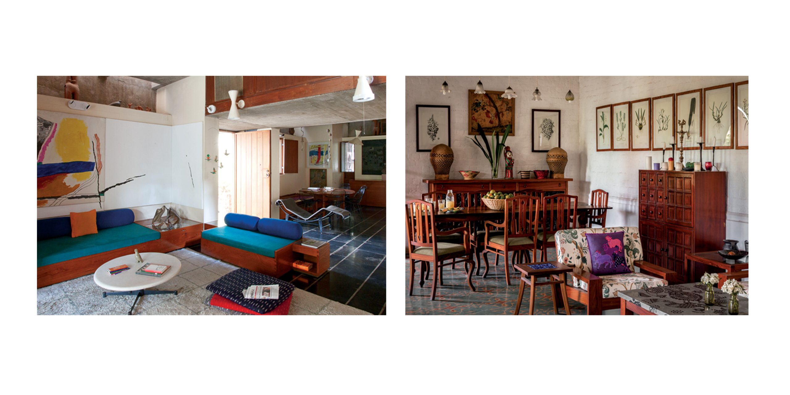 3. Architect Pradeep Sachdeva’s Gurgaon VillaSticking to a contemporary Indian look, a large timber dining table shares space with a comfortable low level seating area. In this open plan, each corner is well utilised with the help of clever storage options. While a family heirloom cabinet makes room for several candles and stands from Dilli Haat, a wooden console with an Andhra style carved front defines the dining area. Peppering the walls are botanical printed photographs from Colombia.