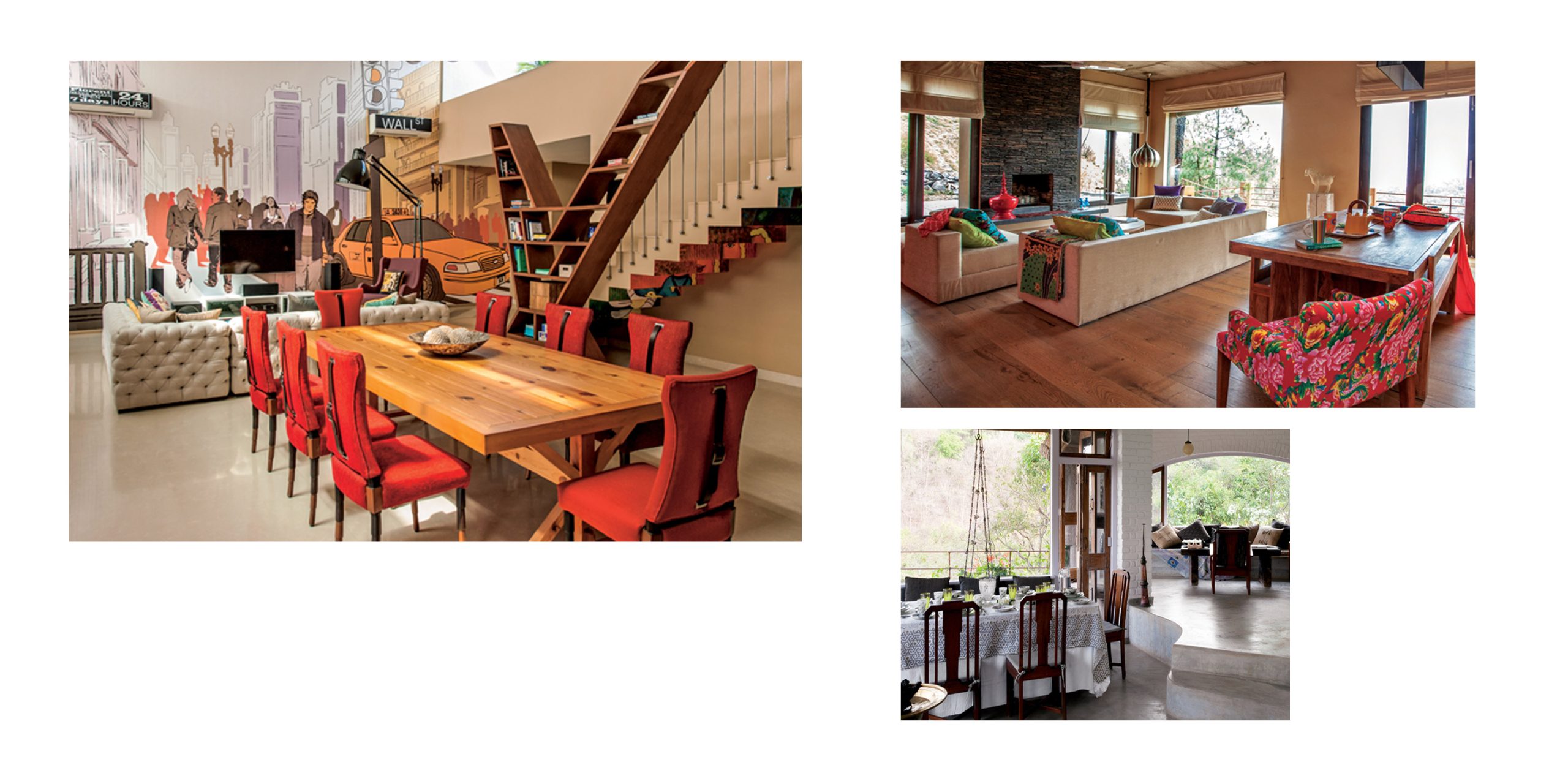 4. A mountain retreat in Kasuali by Sonali PurewalDesigned by interior designer Sonali Purewal, this duplex overlooking the snowcapped Dhauladhar Range makes use of a customised sectional sofa, a small coffee table and silver Pedant Pumpkin light from Indigo to conjure a vibrant living area. To save space, she picks an industrial looking shingled slate fireplace. Creating a dinner area division are subtle elements like the antique horse accent in the far corner and floor lamp.
