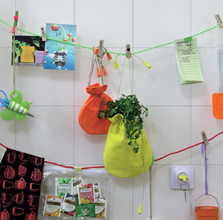 2. Hanging by a Thread: You can create a layered look by using pieces of shaded or patterned ribbons, tying them to the articles and suspending them from the lines. You can also use clothes pins to hang scissors, notes and recipes.