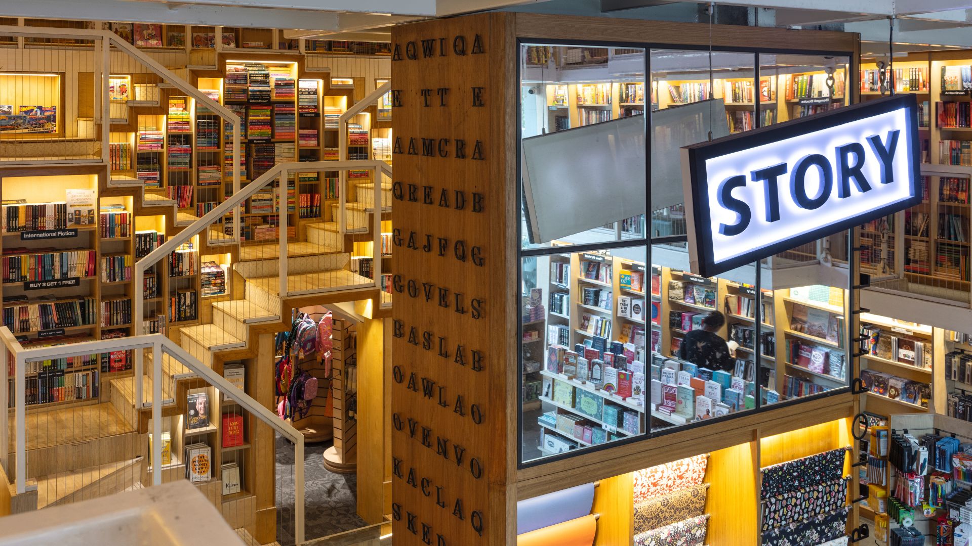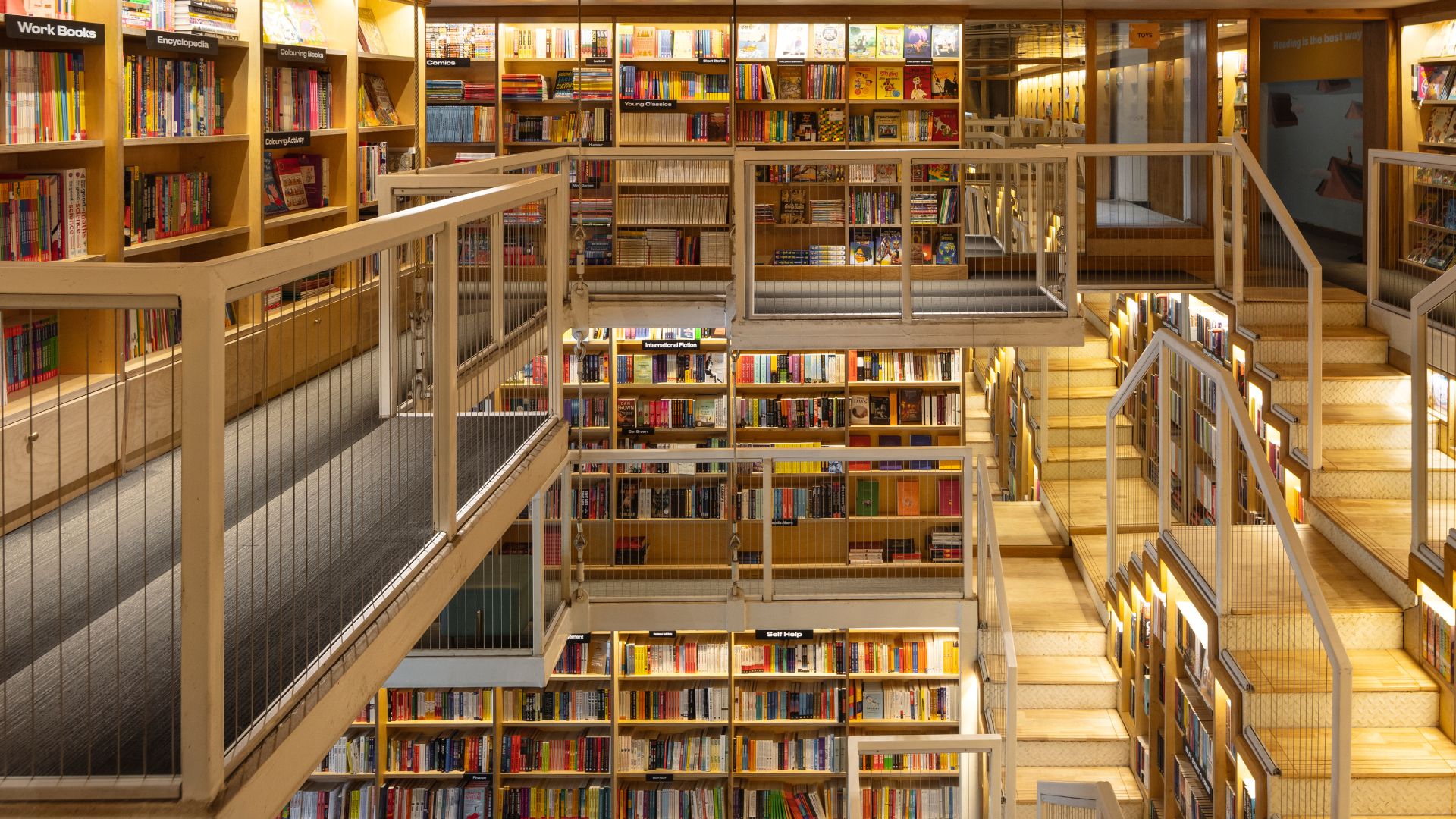 Space constraints notwithstanding, the library opens up to carefully orchestrated display sections achieved through planning and clever materiality. How? The stepwell-inspired staircase at the heart of the space is the answer. If you’ve been to the Chand Baori stepwell or the Panna Meena ka Kund in Rajasthan, the structure’s interlocking, symmetric diamond-like shapes will trigger an immediate recall. Crafted out of checkered sheets that are merely 25 mm thick, this architectural feat is suspended from the top down rather than bottom up: a strategic intervention that allows better circulation at the ground level, while simultaneously connecting three levels of walkways. Punctuated with low-lying benches, these meandering hallways become a nook of your own, perfect for burrowing your head in a book and letting the world fade away. Sit and read on your own β€” or run into a fellow bookworm when climbing up or down the interlocking staircases, perfect for striking up a conversation. The bookstore makes space for it all!Β