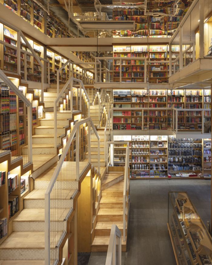 Envisioned in neutral rubberwood and oakwood, the interiors stand back to let the main curation shine: racks and rows of craft papers slung across cabinets, open bookshelves with spines facing curious eyes, and warm, recessed lighting illuminating these never-ending rows. The mirrored ceiling adds to the magic of the space, creating the illusion of a never-ending tower of books beckoning you forward.Β