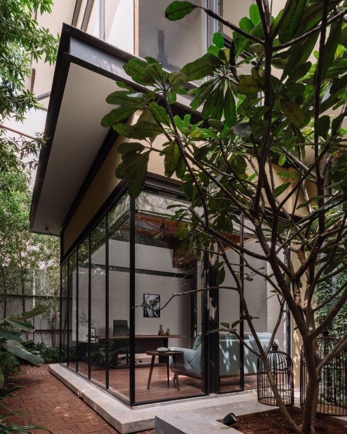 Having a bit more space to work with, the dining table is moved away from the corner and a wooden ledge has been incorporated along the backdrop wall to hold an assortment of pieces—books, candle stands, artworks and more. Continuing the brass accents from the living room is the backdrop wall of the primary bedroom. It features an extended dado of brass plates with a rhythmic groove pattern. In the kid’s bedroom, the architects have played with the notional form of a house by incorporating it into the bed’s frame.