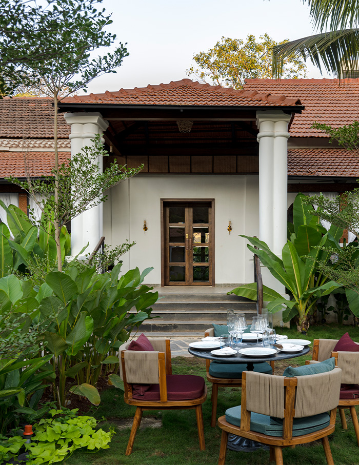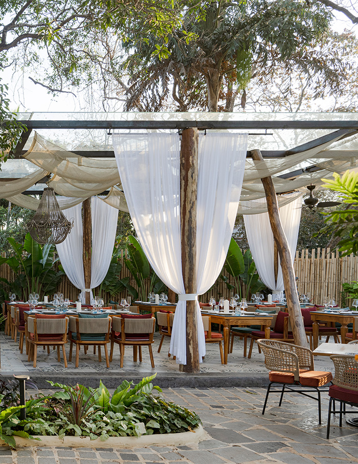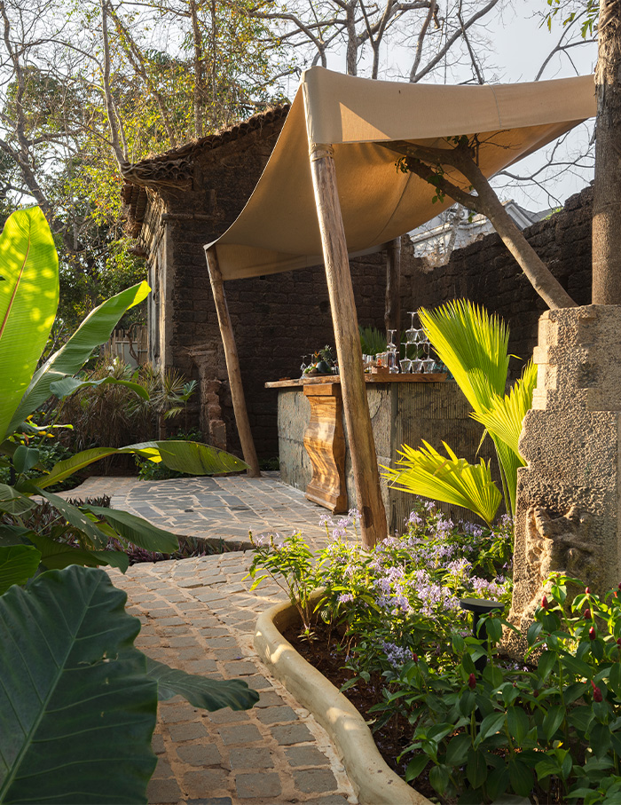 In breezy white and hues of brown, a wisely sketched out 40-seater cabana contoured by nature exemplifies a certain yearning for staying closer to nature while not forgoing leisure and indulgence. The soft, enigmatic demeanour of the restaurant declares the need to create a space so timeless that it takes you back to the past in the blink of an eye. What emerges then is an intimate yet sprawling sanctuary perched on the stretches of North Goa, reciting the architectural beauty of what lies in history and in the rebirth of it.