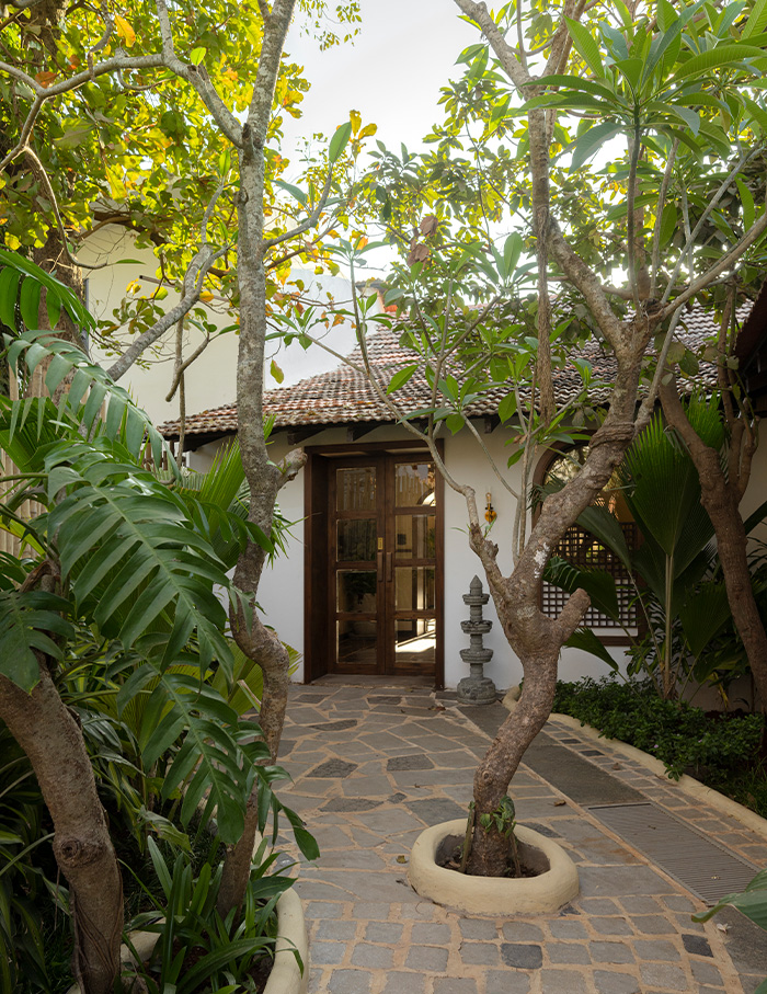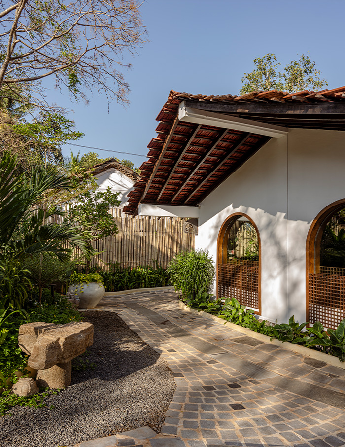 With a carefully paved cobbled pathway that meanders indoors, the pockets of outdoors stand in quietude crafted with natural stone and leftover wastage from internal flooring. “The team retained most of the original trees and planted around 7,000 additional plants to enhance the natural environment. Construction was done around the villa’s ruins, respecting the original structure and allowing nature to blend seamlessly with the architecture,” explains Sowmya.