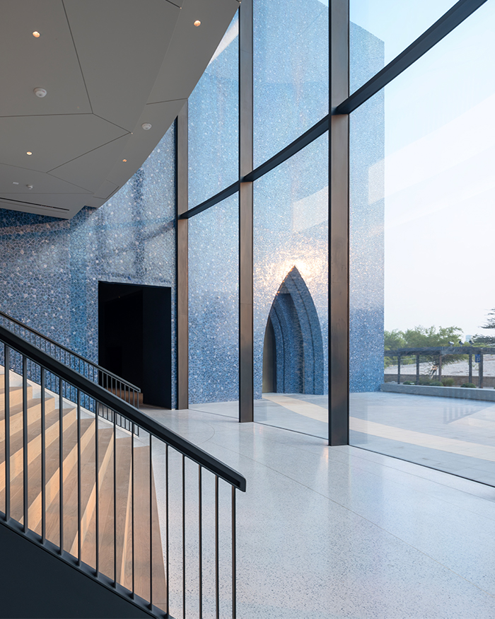 The design developed by India-based architect Martand Khosla, one could say the architecture of the museum itself mirrors Husain. 15 years after the late artist was granted citizenship in Qatar, the 3,000 sq mt site rises up as a material translation of Husain’s sketch that dates back to 2008. The blues and greys of the building along with the motifs reimagine the artwork’s canvas, evoking blurring lines between art, architecture, imagination and reality. “The blue house emerged directly from the sketch, while the grey house emerged as an architectural response to the blue house,” informs Martand.