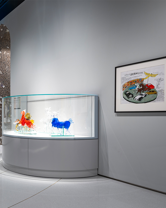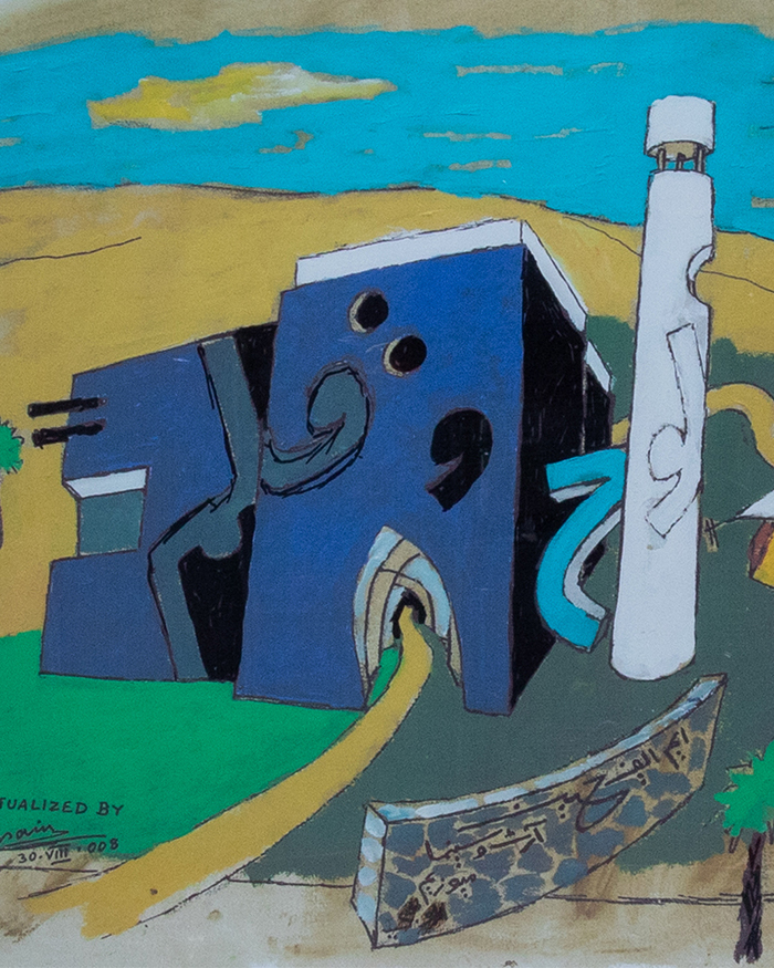 The design developed by India-based architect Martand Khosla, one could say the architecture of the museum itself mirrors Husain. 15 years after the late artist was granted citizenship in Qatar, the 3,000 sq mt site rises up as a material translation of Husain’s sketch that dates back to 2008. The blues and greys of the building along with the motifs reimagine the artwork’s canvas, evoking blurring lines between art, architecture, imagination and reality. “The blue house emerged directly from the sketch, while the grey house emerged as an architectural response to the blue house,” informs Martand.