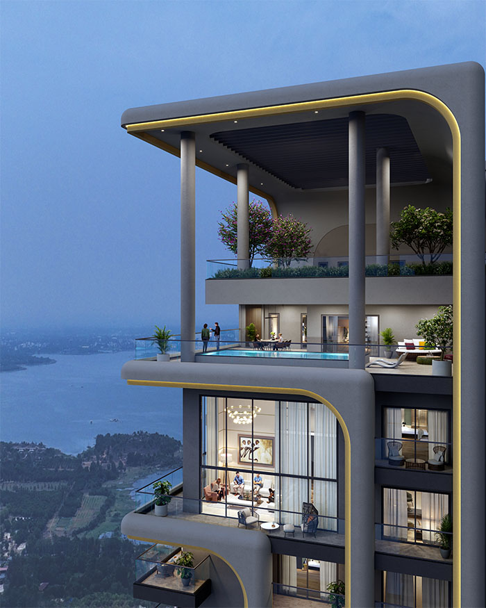 Beneath this sculptural verticality lies a deeply human design philosophy. Nearly 1,200 residences, ranging from 3.5BHK to 4.5BHK homes, are complemented by ten triplex penthouses, each with private sky gardens and pools. The podium below acts as a verdant base — a “green mountain plateau” where cascading planters, stone strata and open terraces ground the towers in the earth’s quiet strength. At its core, the design is about flow — of light, of air, of life itself.