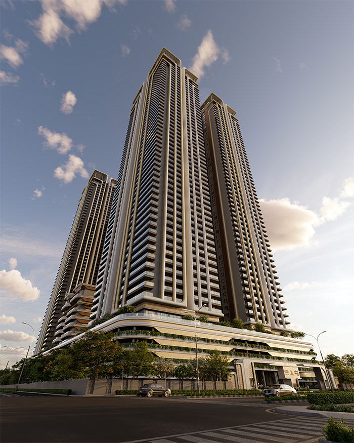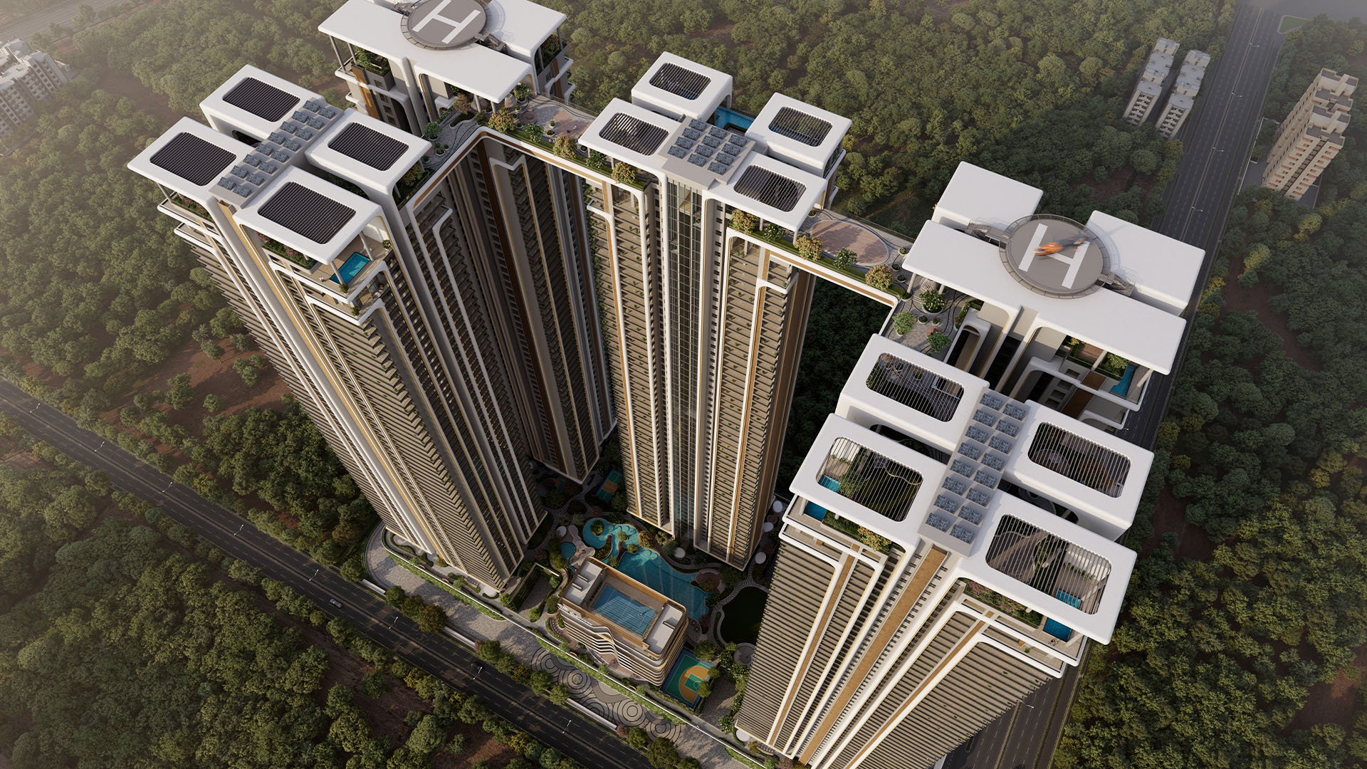 Beneath this sculptural verticality lies a deeply human design philosophy. Nearly 1,200 residences, ranging from 3.5BHK to 4.5BHK homes, are complemented by ten triplex penthouses, each with private sky gardens and pools. The podium below acts as a verdant base — a “green mountain plateau” where cascading planters, stone strata and open terraces ground the towers in the earth’s quiet strength. At its core, the design is about flow — of light, of air, of life itself.