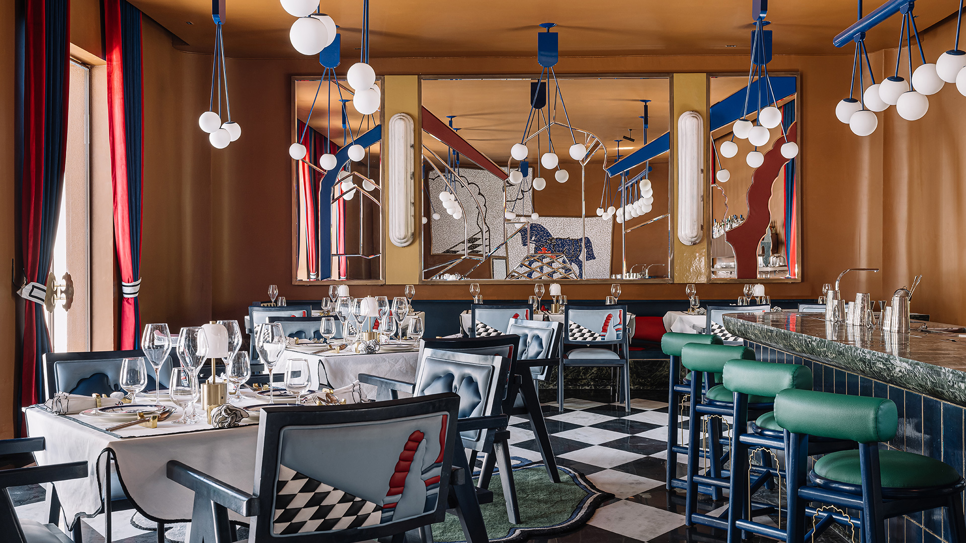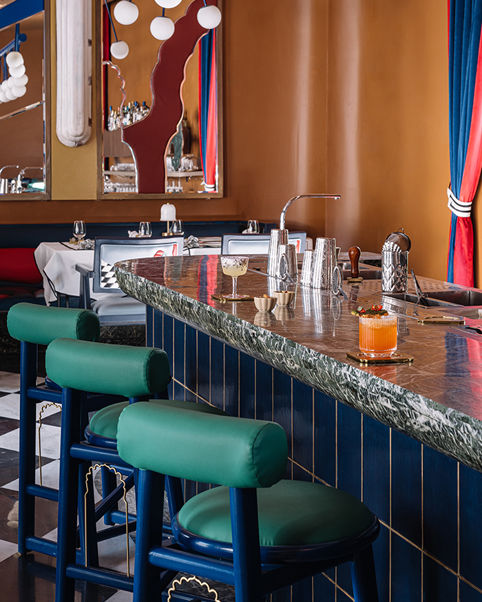 The internal dining area with chequered floors and teal tone highchairs at the bar zone with a marbletop table; Photography by Ishita Sitwala