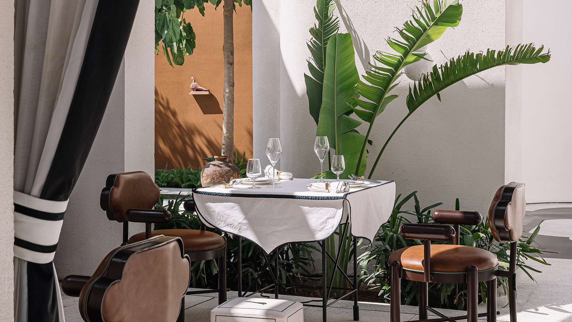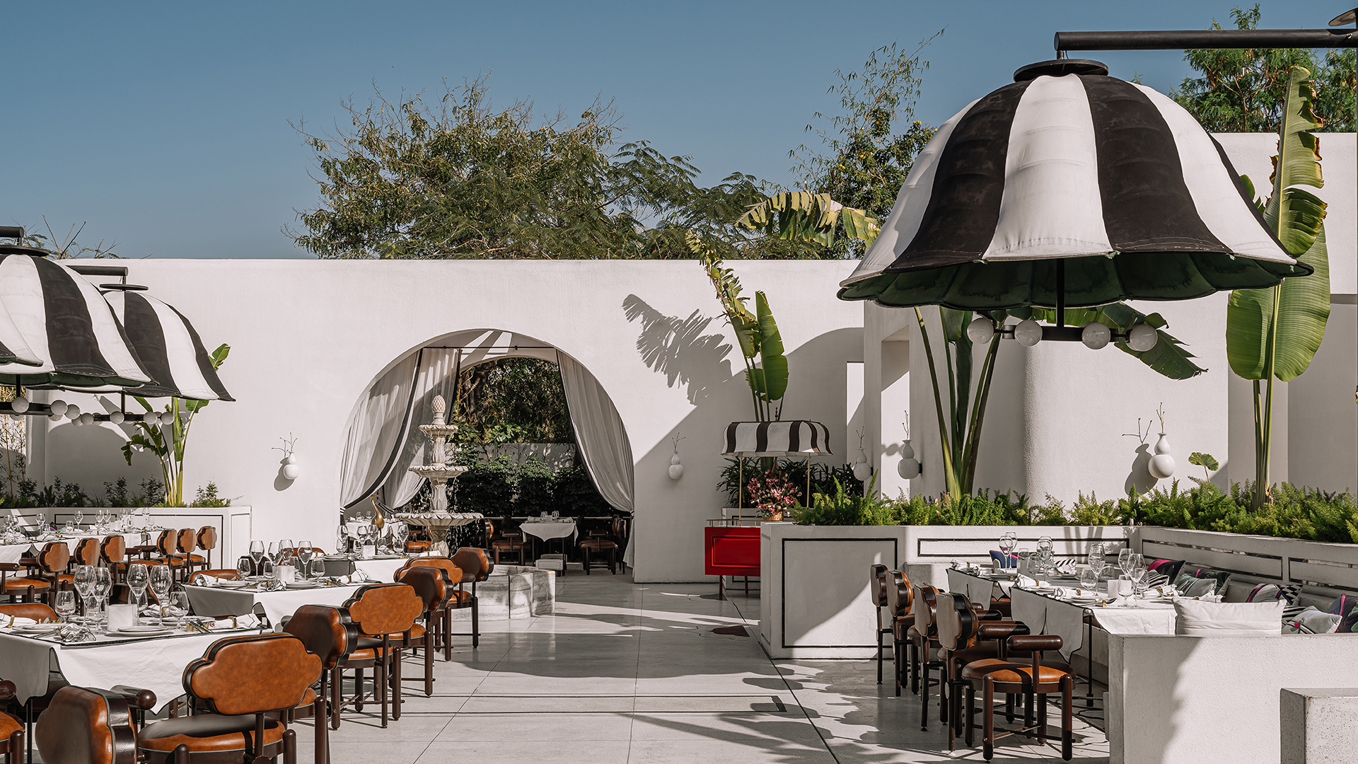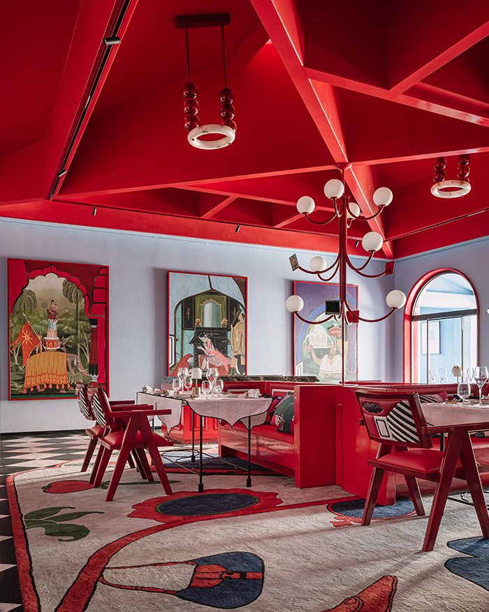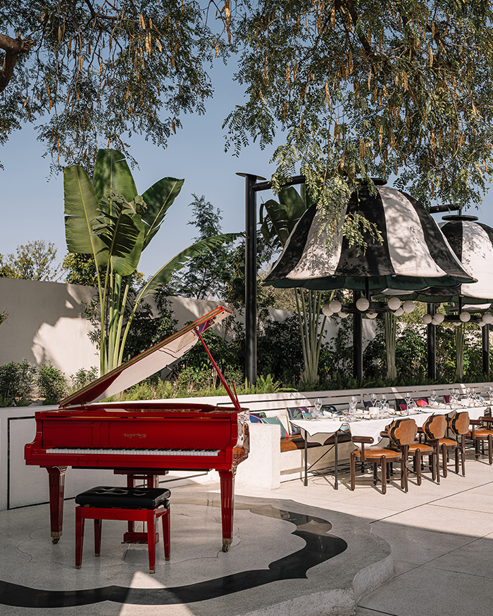 But while the white courtyards echo their namesake fountain only in hue and material, the Pink City is an inseparable part of the property. Ask how, and Shantanu rattles off a long list. “Everything has a piece of Jaipur in it. Even the carpet you see, the cushions, the leather upholstery on the Chandigarh chairs!” he affirms. This is not just Jaipur in isolation: it is Shantanu’s Jaipur, and decisively so. As you enter the chowk, an open-air dining space anchored by a fountain (the best spot to aim your coins at, à la Trevi) and a red piano, three other zones emerge: the Plume Bar, a private dining space Shantanu dubs as the “Vanity Room”, and an open-air dining section covered by the Indian shamiana’s more contemporary sibling.