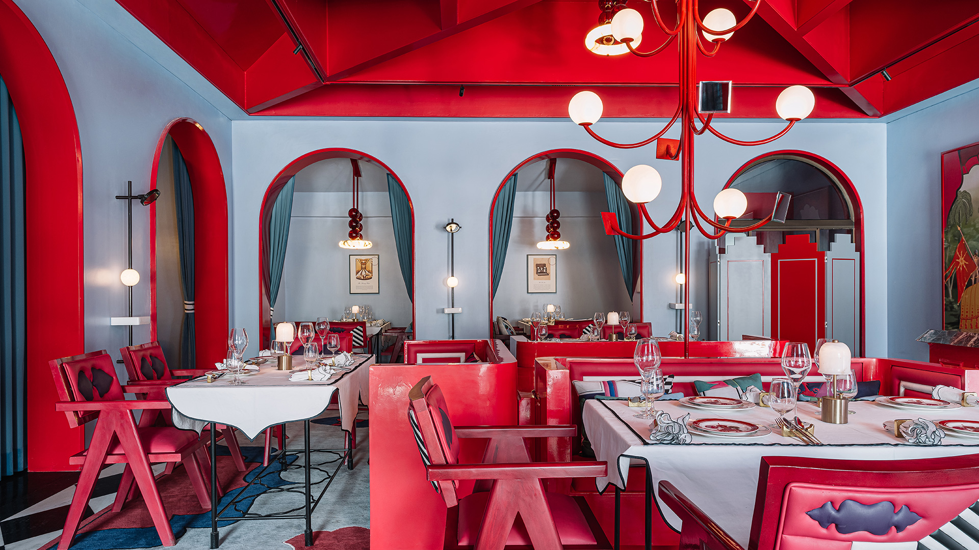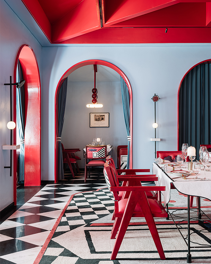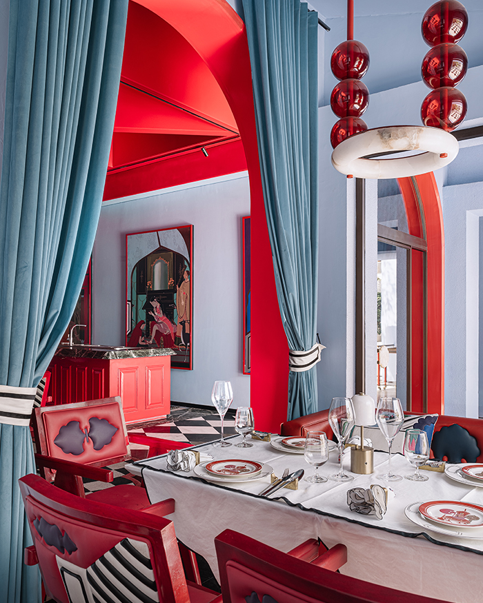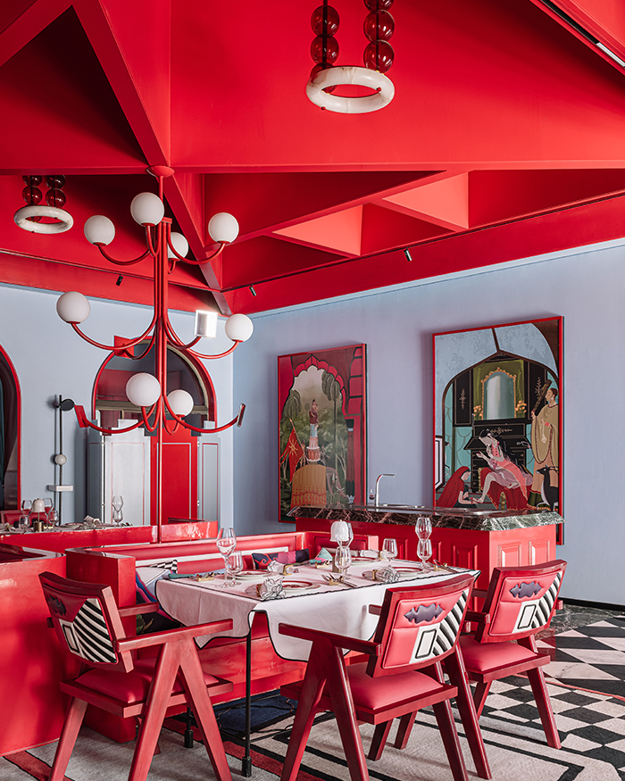 Illuminating the tables is Chudi by Shantanu Garg Design, a light pendant that resembles an Alabaster bangle held aloft by red glass beads; Photography by Ishita Sitwala