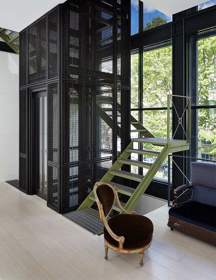 While its heritage construction offered a priceless historic allure which Karam wanted to retain, he also wanted to bring in his signature, distinctly modern touch. So he added three levels above to break away from the impregnable cement mould below and to bask in abundant daylight with the help of glass and metal. The transparent, grid-like facade offers a visual connect across the abode and gorgeous vistas of the Bois de Boulogne.