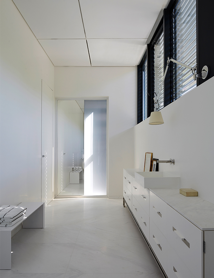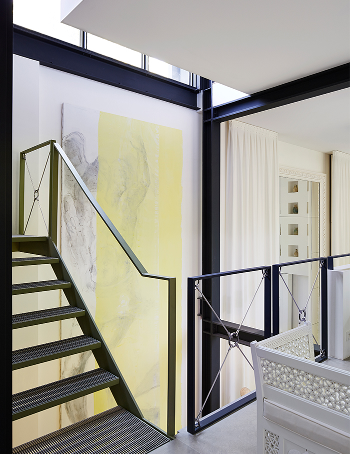 This stark yet pleasing contrast of surfaces continues indoors and can be seen in the metallic designs and frames of the elevators and stairs, bound by white painted walls. Karam stuck to a dry construction palette throughout, glimpses of which can be seen in his choice of materials comprising wood, Corian, Fermacell and stucco.