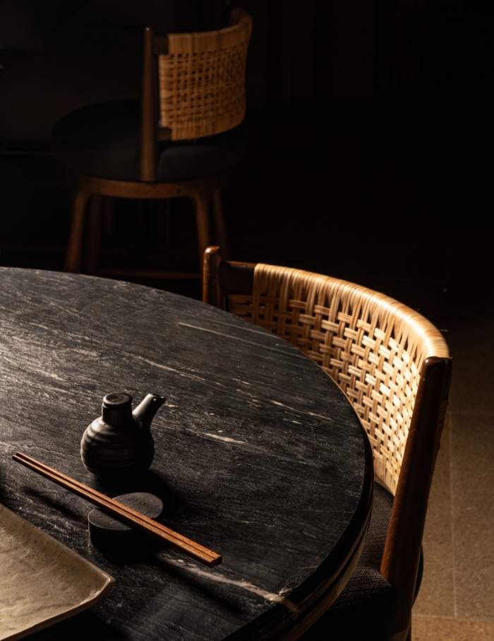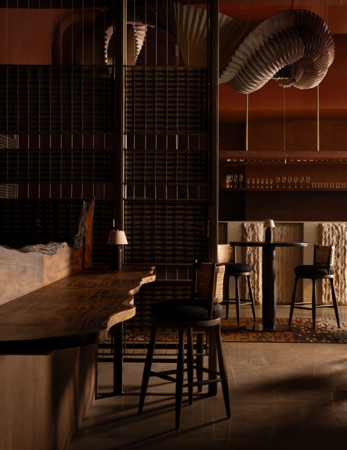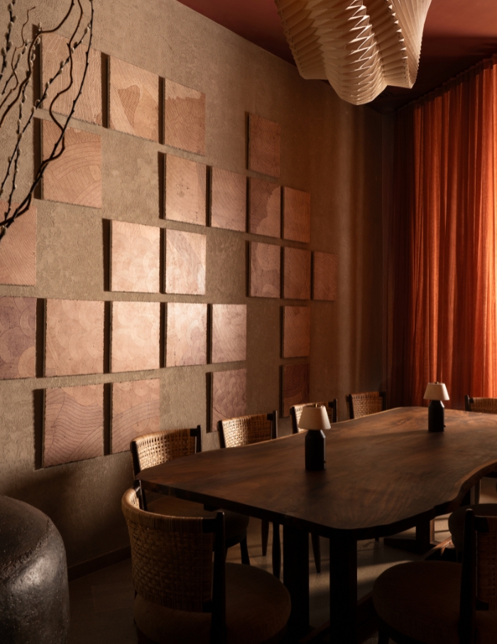 The private dining space unveils new material interplays and elements. A live-edged wooden table occupies pride of place. Here, the pitted walls are mounted with bespoke concrete tablets imprinted with water-like waves and whirls.