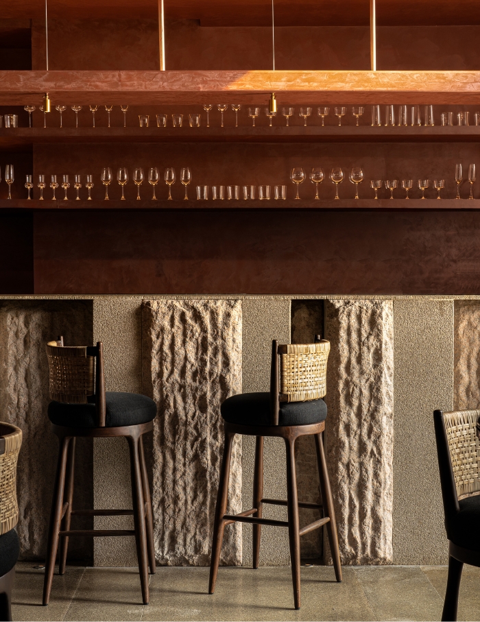 Japanese shoji-like doors ensconce the monolithic quarry-cut bar. A sculptural delight, the structure is rugged in parts, smoother in some — akin to the ebb and flow of a river. A sleek metal bar back plays foil to its rough-hewn surface.