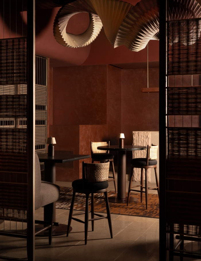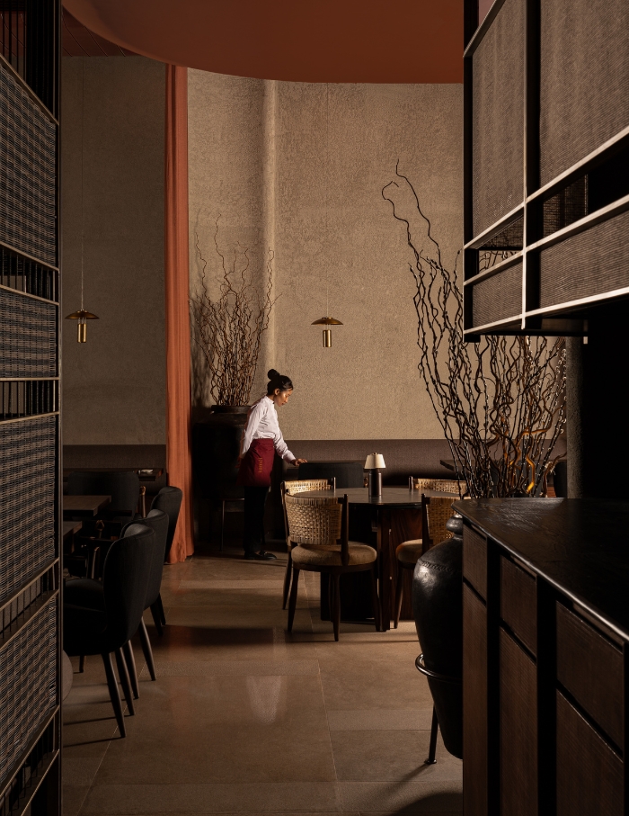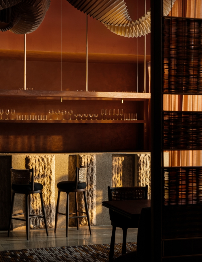 Material and light. A powerful duo, as the dining space and bar prove. Lantern-like brass pendant lights float over the tables, casting a dim glow. Beige and terracotta pitted walls wrap the restaurant in a cosy embrace. The layout, albeit open, ducks behind rattan dividers and gauzy curtains that keep the intrigue alive.
