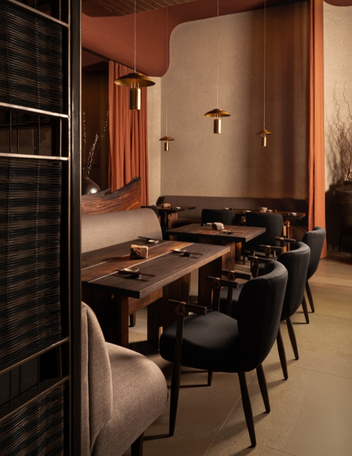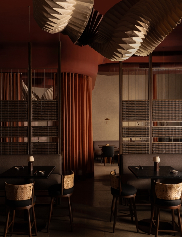 The earthy interiors are divided into halves by thin latticework screens and billowing drapes. A mix of curves, organic forms and sharp, leading lines create a space both cosy yet true to minimalist Japanese sensibilities.