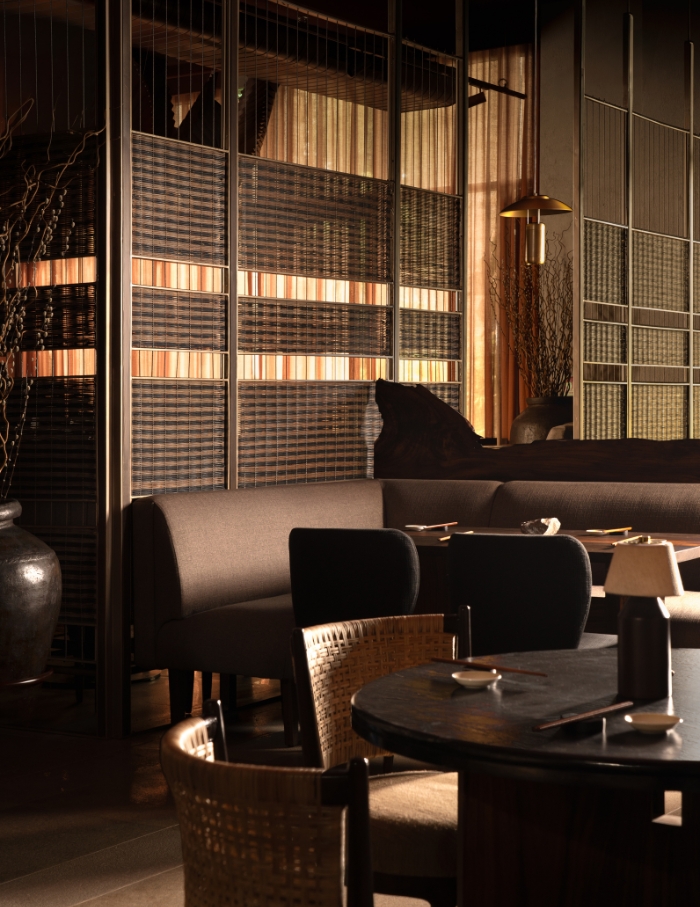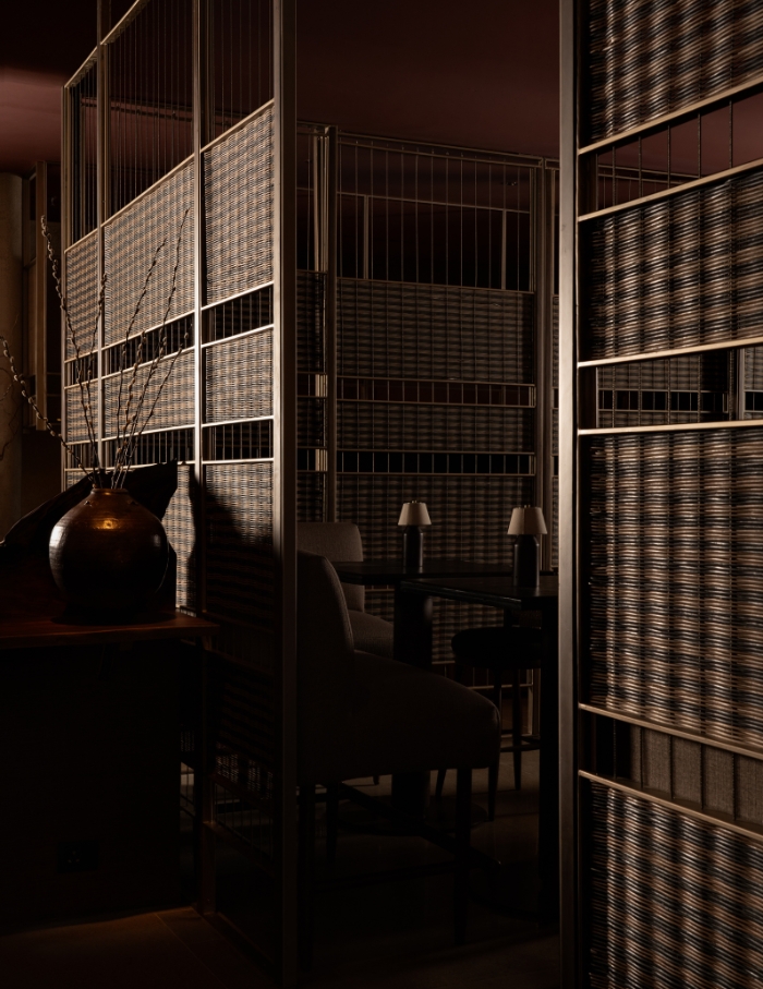 The partitions, made of handcrafted warp and weft in metal wire and hand-dyed rattan, add both a visual break and character to the space — rather like a palate cleanser.