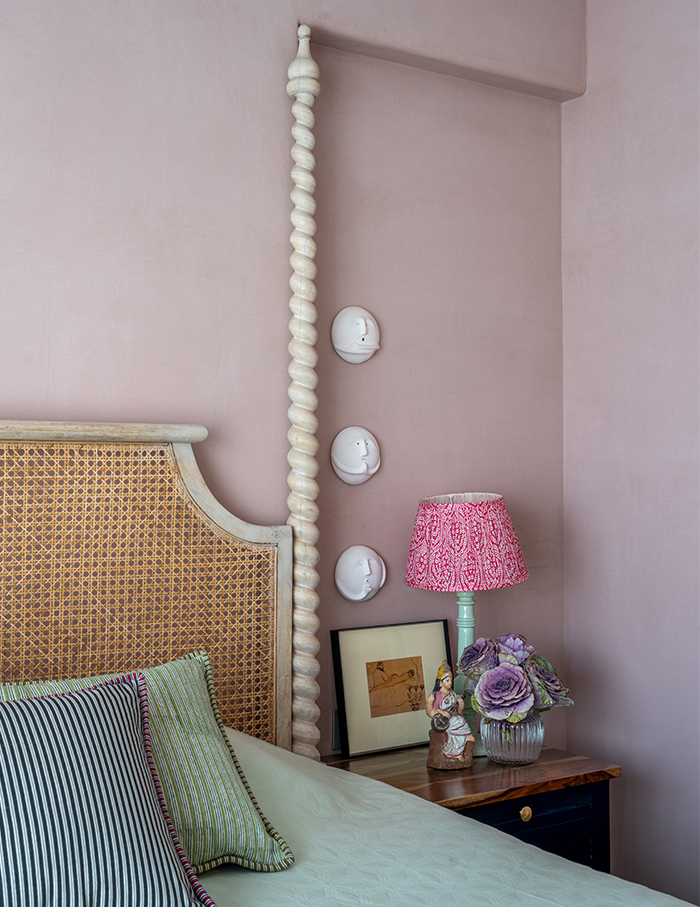 To add a sense of warmth that was lacking in the original structure, the entire house, on a foundational level, possesses rose pink lime-washed walls along with antique decor. The decor was picked up from antique stores in Jaipur whilst also incorporating natural textures like reclaimed woods, raffia, clay and terracotta tones in the home. The abode features decor collectibles from Jaipur Rugs, Ikka Dukka, Samurai Home, Gulmohar Lane and Crafters.