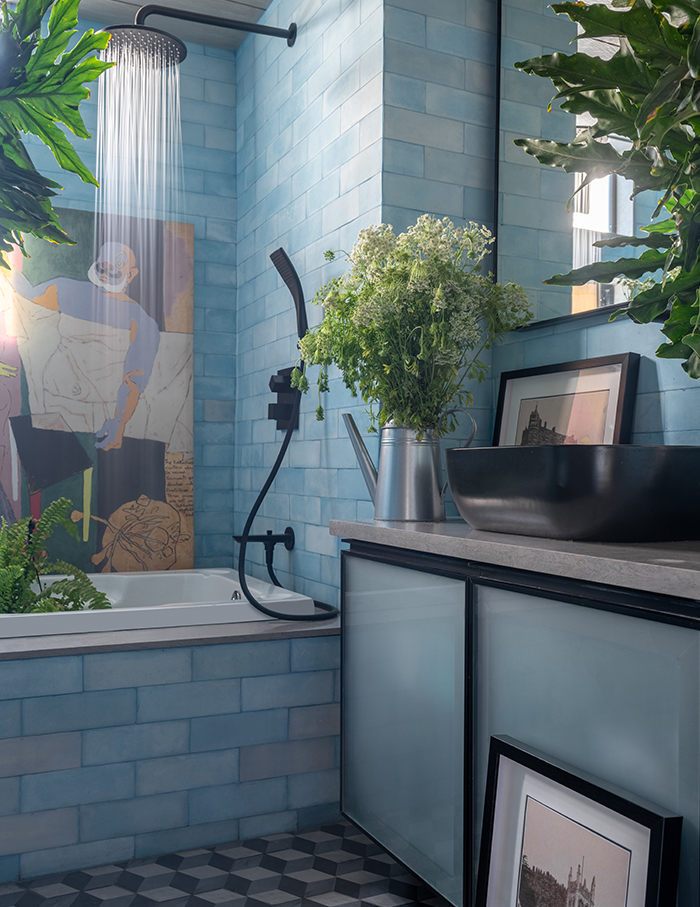 “We wanted the living room to feel like a living museum—a reflection of all the countries they have been to. I love a clash of materials. I love a clash of periods. I love the tension and the friction that it creates because I think that’s what makes beautiful design, and that’s what causes people’s eye to linger just a little bit more,” confesses Kavan.